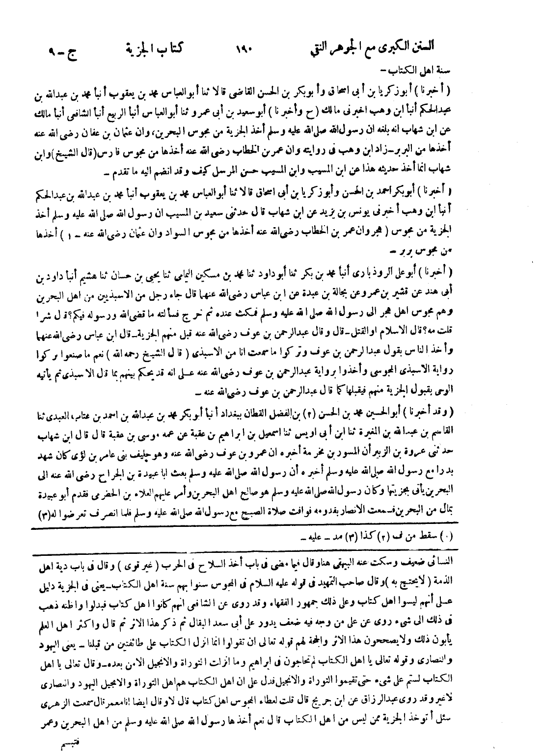 [النسائي ضعيف وسكت عنه البيهقى هنا وقال فيما مضى في باب أخذ السلاح في الحرب (غير قوى) وقال في باب دية اهل الذمة (لا يحتج به) وقال صاحب التمهيد في قوله عليه السلام في المجوس سنوا بهم سنة اهل الكتاب - يعنى في الجزية دليل على أنهم ليسوا اهل كتاب وعلى ذلك جمهور الفقهاء وقد روى عن الشافعي انهم كانوا اهل كتاب فبدلوا واظنه ذهب في ذلك إلى شئ روى عن على من وجه فيه ضعف يدور على أبى سعد البقال ثم ذكر هذا الاثر ثم قال واكثر اهل العلم يأبون ذلك ولا يصححون هذا الاثر والحجة لهم قوله تعالى ان تقولوا انما انزل الكتاب على طائفتين من قبلنا - يعنى اليهود والنصارى وقوله تعالى يا اهل الكتاب لم تحاجون في ابراهيم وما انزلت التوراة والانجيل الا من بعده - وقال تعالى يا اهل الكتاب لستم على شئ حتى تقيموا التوراة والانجيل فدل على ان اهل الكتاب هم اهل التوراة والانجيل اليهود والنصارى لا غير وقد روى عبد الرزاق عن ابن جريج قال قلت لعطاء المجوس اهل كتاب قال لا وقال ايضا انا معمر قال سمعت الزهري سئل أتوخذ الجزية ممن ليس من اهل الكتاب قال نعم أخذها رسول الله صلى الله عليه وسلم من اهل البحرين وعمر