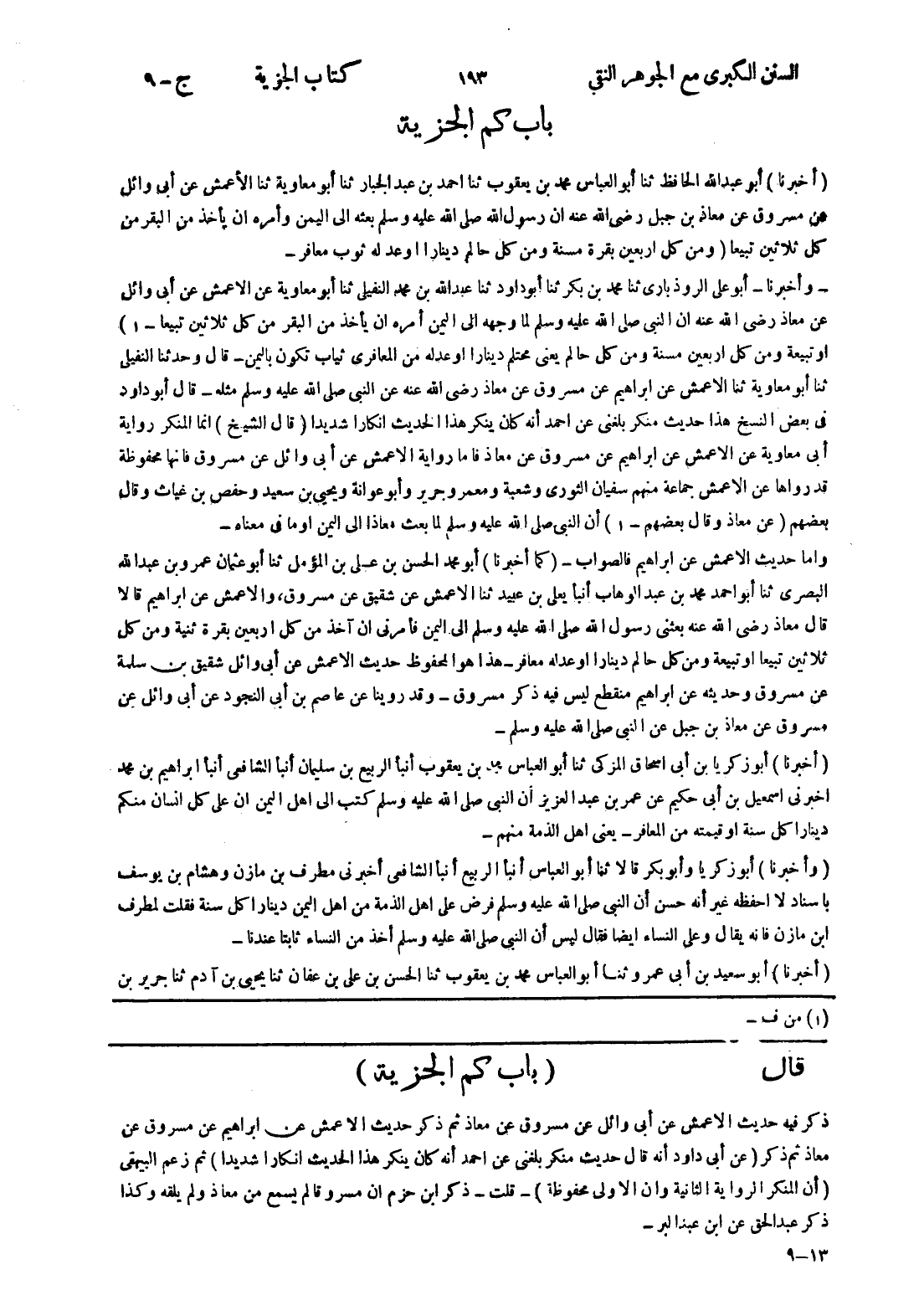 [قال (باب كم الجزية) ذكر فيه حديث الاعمش عن أبى وائل عن مسروق عن معاذ ثم ذكر حديث الاعمش عن ابراهيم عن مسروق عن معاذ ثم ذكر (عن أبى داود أنه قال حديث منكر بلغني عن احمد أنه كان ينكر هذا الحديث انكارا شديدا) ثم زعم البيهقى (أن المنكر الرواية الثانية وان الاولى محفوظة) - قلت - ذكر ابن حزم ان مسروقا لم يسمع من معاذ ولم يلقه وكذا ذكر عبد الحق عن ابن عبد البر -]