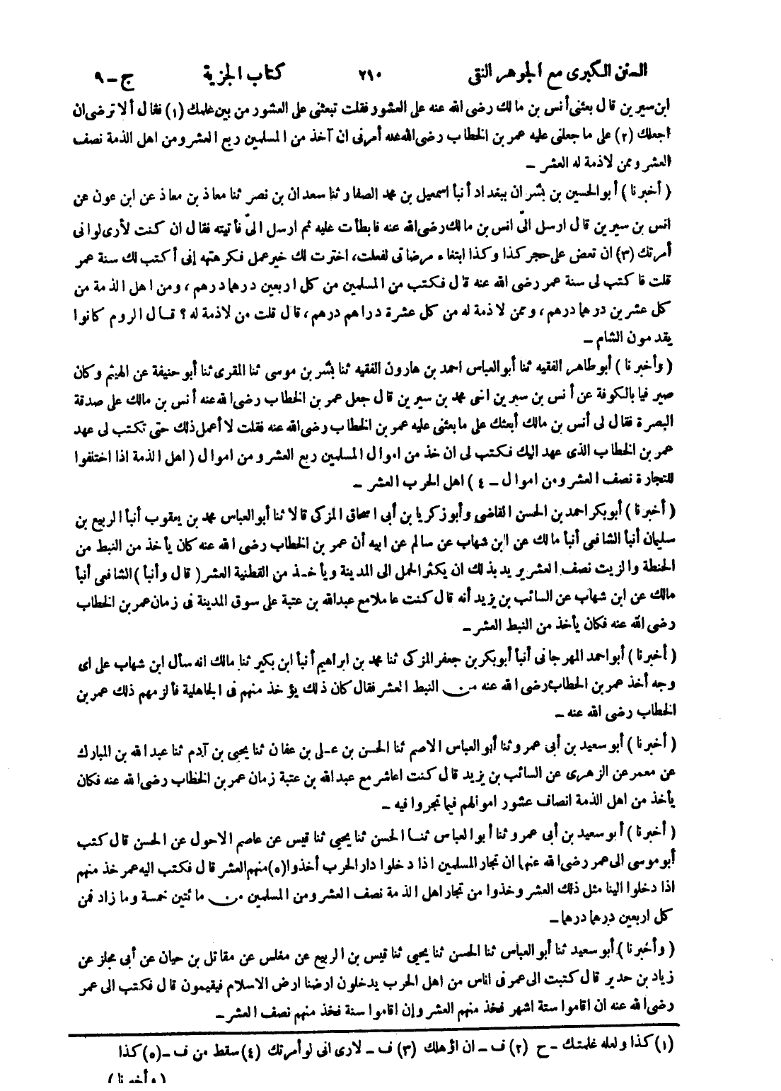 ابن سيرين قال بعثنى أنس بن مالك رضى الله عنه على العشور فقلت تبعثني على العشور من بين علمك (1) فقال ألا ترضى ان اجعلك (2) على ما جعلني عليه عمر بن الخطاب رضى الله عنه أمرنى ان آخذ من المسلمين ربع العشر ومن اهل الذمة نصف العشر وممن لا ذمة له العشر