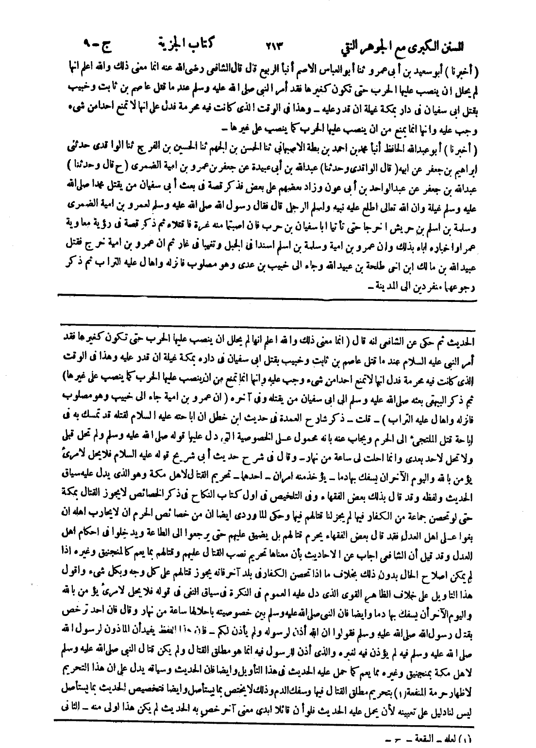 [الحديث ثم حكى عن الشافعي انه قال (انما معنى ذلك والله اعلم انها لم يحلل ان ينصب عليها الحرب حتى تكون كغيرها فقد أمر النبي عليه السلام عندما قتل عاصم بن ثابت وخبيب بقتل ابى سفيان في داره بمكة غيلة ان قدر عليه وهذا في الوقت الذى كانت فيه محرمة فدل انها لا تمنع احدا من شئ وجب عليه وانها انما تمنع من ان ينصب عليها الحرب كما ينصب على غيرها) ثم ذكر البيهقى بعثه صلى الله عليه وسلم إلى ابى سفيان من يقتله وفى آخره (ان عمرو بن امية جاء إلى خبيب وهو مصلوب فانزله واهال عليه التراب) - قلت - ذكر شارح العمدة في حديث ابن خطل ان اباحته عليه السلام لقتله قد تمسك به في اباحة قتل الملتجئ إلى الحرم ويجاب عنه بانه محمول على الخصوصية التى دل عليها قوله صلى الله عليه وسلم ولم تحل قبلى ولا تحل لاحد بعدى وانما احلت لى ساعة من نهار - وقال في شرح حديث أبى شريح قوله عليه السلام فلا يحل لامرئ يؤمن بالله واليوم الآخر ان يسفك بها دما - يؤخذ منه امران - احدهما - تحريم القتال لاهل مكة وهو الذى يدل عليه سياق الحديث ولفظه وقد قال بذلك بعض الفقهاء وفى التلخيص في اول كتاب النكاح في ذكر الخصائص لا يجوز القتال بمكة حتى لو تحصن جماعة من الكفار فيها لم يجز لنا قتالهم فيها وحكى الماوردى ايضا ان من خصائص الحرم ان لا يحارب اهله ان بغوا على اهل العدل فقد قال بعض الفقهاء يحرم قتالهم بل يضيق عليهم حتى يرجعوا إلى الطاعة ويدخلوا في احكام اهل العدل وقد قيل أن الشافعي اجاب عن الاحاديث بأن معناها تحريم نصب القتال عليهم وقتالهم بما يعم كالمنجنيق وغيره إذا لم يمكن اصلاح الحال بدون ذلك بخلاف ما إذا تحصن الكفار في بلد آخر فانه يجوز قتالهم على كل وجه وبكل شئ واقول هذا التأويل على خلاف الظاهر القوى الذى دل عليه العموم في النكرة في سياق النفى في قوله فلا يحل لامرئ يؤمن بالله واليوم الآخر أن يسفك بها دما وايضا فان النبي صلى الله عليه وسلم بين خصوصيته باحلالها ساعة من نهار وقال فان احد ترخص بقتال رسول الله صلى الله عليه وسلم فقولوا ان الله أذن لرسوله ولم يأذن لكم - فان هذا اللفظ يفيد أن المأذون لرسول الله صلى الله عليه وسلم فيه لم يؤذن فيه لغيره والذى أذن للرسول فيه انما هو مطلق القتال ولم يكن قتال النبي صلى الله عليه وسلم لاهل مكة بمنجنيق وغيره مما يعم كما حمل عليه الحديث في هذا التأويل وايضا فان الحديث وسياقه يدل على ان هذ التحريم لاظهار حرمة المنفعة (1) بتحريم مطلق القتال فيها وسفك الدم وذلك لا يختص بما يستأصل وايضا فتخصيص الحديث بما يستأصل ليس لنا دليل على تعيينه لان يحمل عليه الحديث فلو أن قائلا ابدى معنى آخر خص به الحديث لم يكن هذا اولى منه - الثاني