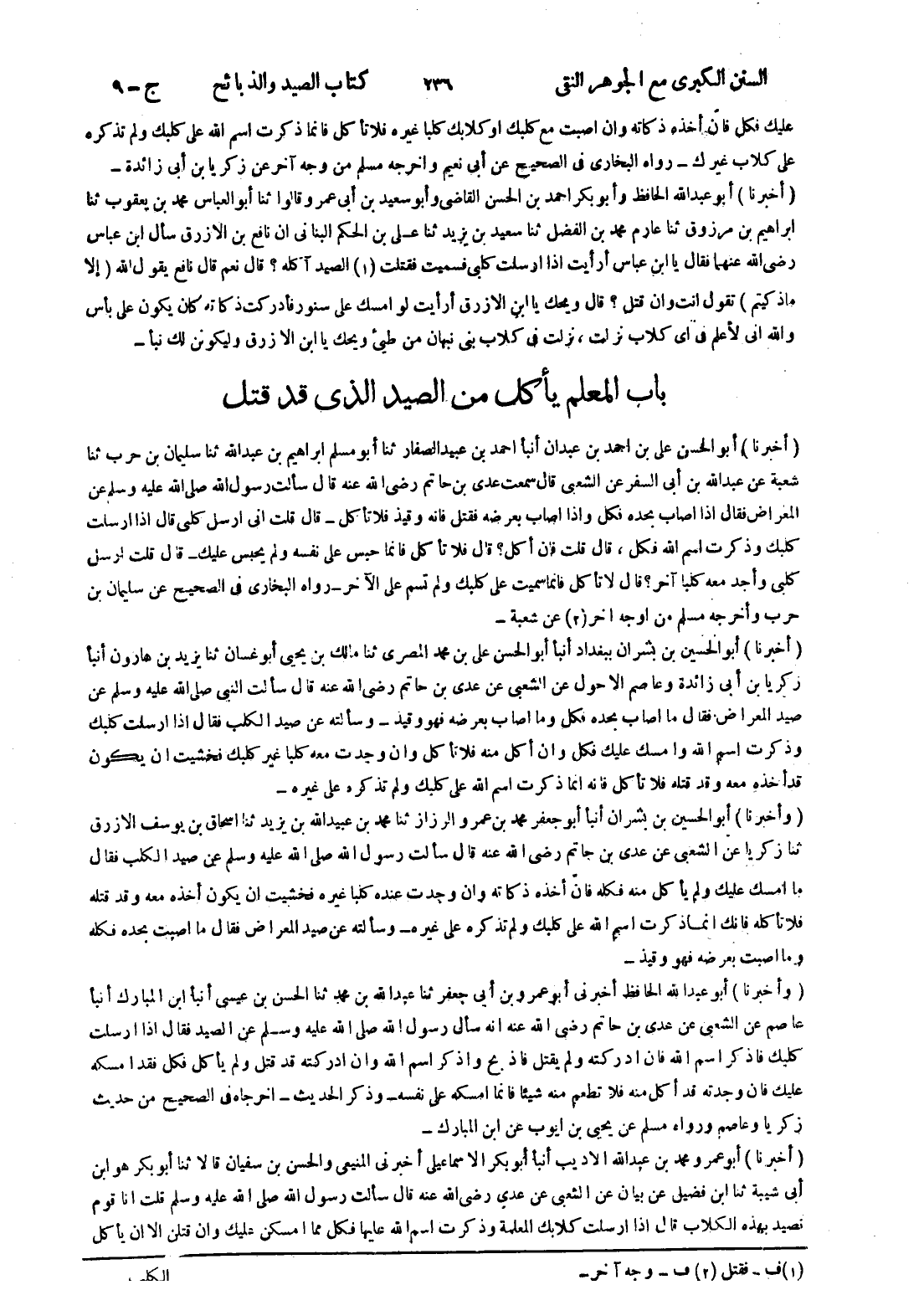 - (أخبرنا) أبو عمرو محمد بن عبد الله الاديب أنبأ أبو بكر الاسماعيلي أخبرني المنيعى والحسن بن سفيان قالا ثنا أبو بكر هو ابن أبى شيبة ثنا ابن فضيل عن بيان عن الشعبى عن عدى رضى الله عنه قال سألت رسول الله صلى الله عليه وسلم قلت انا قوم نصيد بهذه الكلاب قال إذا ارسلت كلابك المعلمة وذكرت اسم الله عليها فكل مما امسكن عليك وان قتلن الا ان يأكل