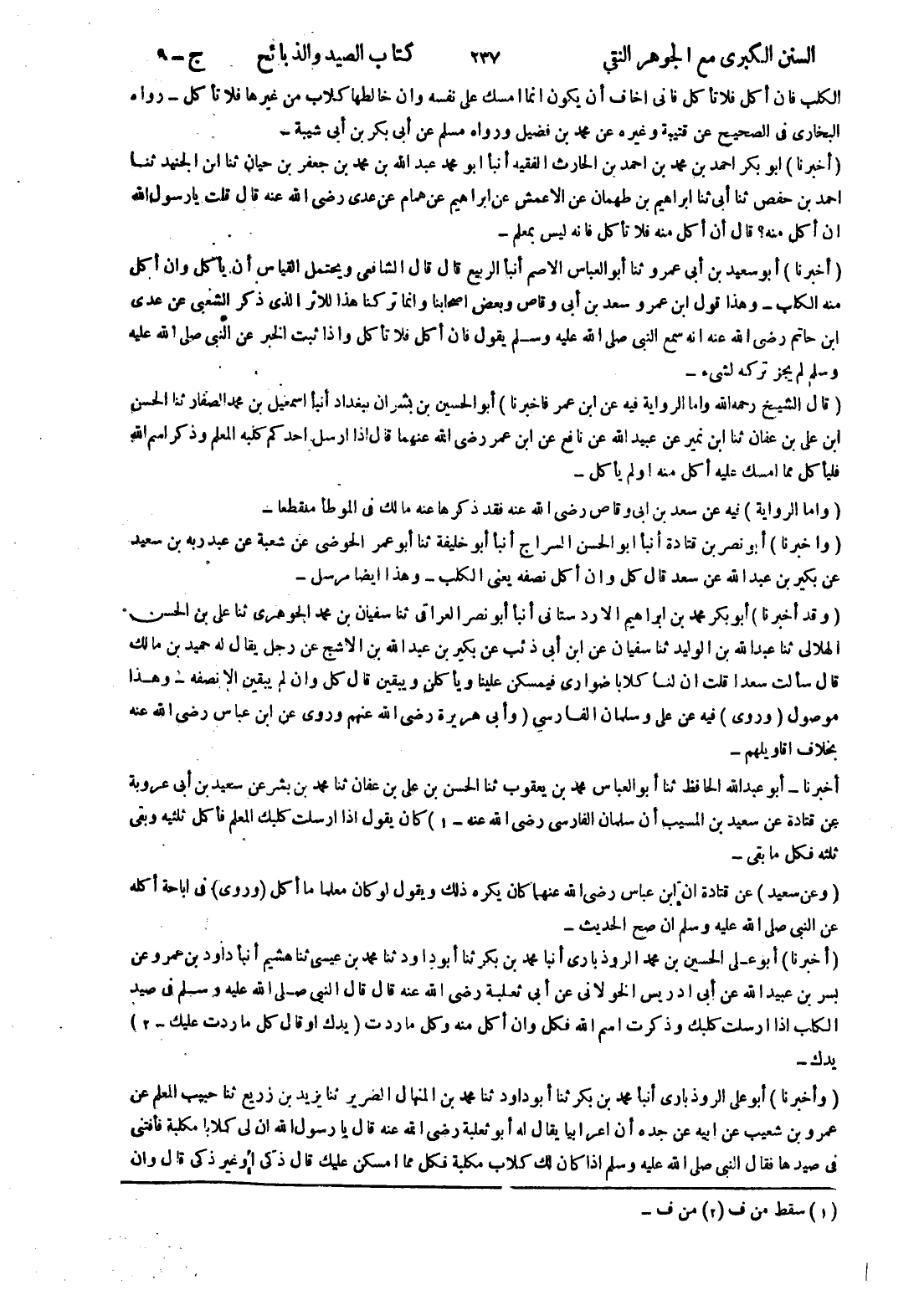 - (وأخبرنا) أبو نصر بن قتادة أنبأ أبو الحسن السراج أنبأ أبو خليفة ثنا أبو عمر الحوضى عن شعبة عن عبد ربه بن سعيد عن بكير بن عبد الله عن سعد قال كل وان أكل نصفه يعنى الكلب - وهذا ايضا مرسل - (وقد أخبرنا) أبو بكر محمد بن ابراهيم الاردستانى أنبأ أبو نصر العراقى ثنا سفيان بن محمد الجوهرى ثنا على بن الحسن الهلالي ثنا عبد الله بن الوليد ثنا سفيان عن ابن أبى ذئب عن بكير بن عبد الله بن الاشج عن رجل يقال له حميد بن مالك قال سألت سعدا قلت ان لنا كلابا ضوارى فيمسكن علينا ويأكلن ويبقين قال كل وان لم يبقين الا نصفه - وهذا موصول (وروى) فيه عن علي وسلمان الفارسي (وأبى هريرة رضى الله عنهم وروى عن ابن عباس رضى الله عنه بخلاف اقاويلهم - اخبرنا - أبو عبد الله الحافظ ثنا أبو العباس محمد بن يعقوب ثنا الحسن بن على بن عفان ثنا محمد بن بشر عن سعيد بن أبى عروبة عن قتادة عن سعيد بن المسيب أن سلمان الفارسي رضي الله عنه - 1) كان يقول إذا ارسلت كلبك المعلم فأكل ثلثيه وبقى