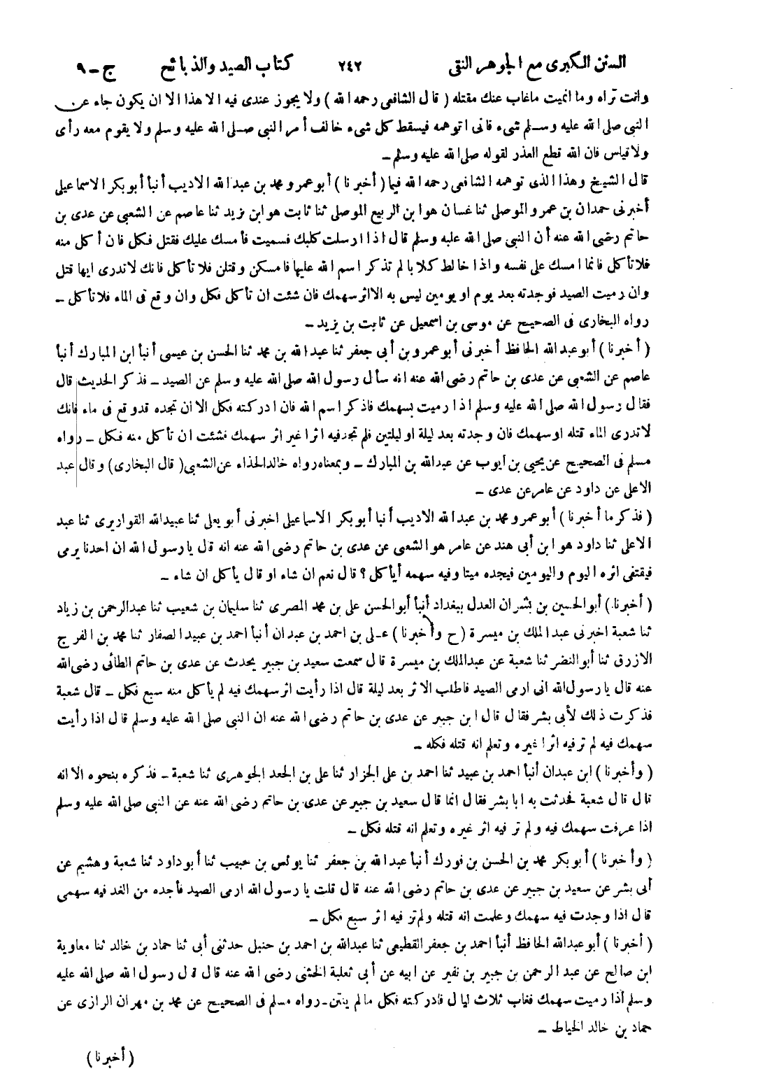 (أخبرنا) أبو عمرو محمد بن عبد الله الاديب أنبأ أبو بكر الاسماعيلي أخبرني حمدان بن عمرو الموصلي ثنا غسان هو ابن الربيع الموصلي ثنا ثابت هو ابن يزيد ثنا عاصم عن الشعبى عن عدى بن حاتم رضى الله عنه أن النبي صلى الله عليه وسلم قال إذا ارسلت كلبك فسميت فأمسك عليك فقتل فكل فان أكل منه فلا تأكل فانما امسك على نفسه وإذا خالط كلابا لم تذكر اسم الله عليها فامسكن وقتلن فلا تأكل فانك لا تدرى ايها قتل وان رميت الصيد فوجدته بعد يوم أو يومين ليس به الا اثر سهمك فان شئت ان تأكل فكل وان وقع في الماء فلا تأكل - رواه البخاري في الصحيح عن موسى بن اسمعيل عن ثابت بن يزيد