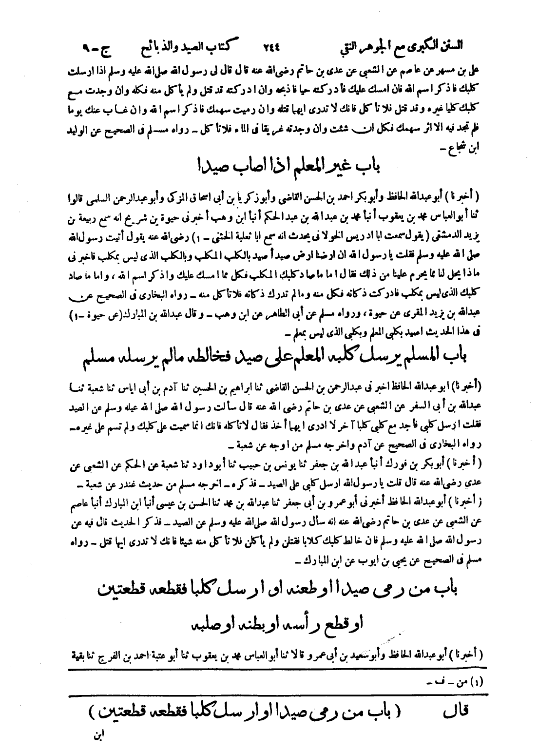[قال (باب من رمى صيدا أو ارسل كلبا فقطعه قطعتين) ]