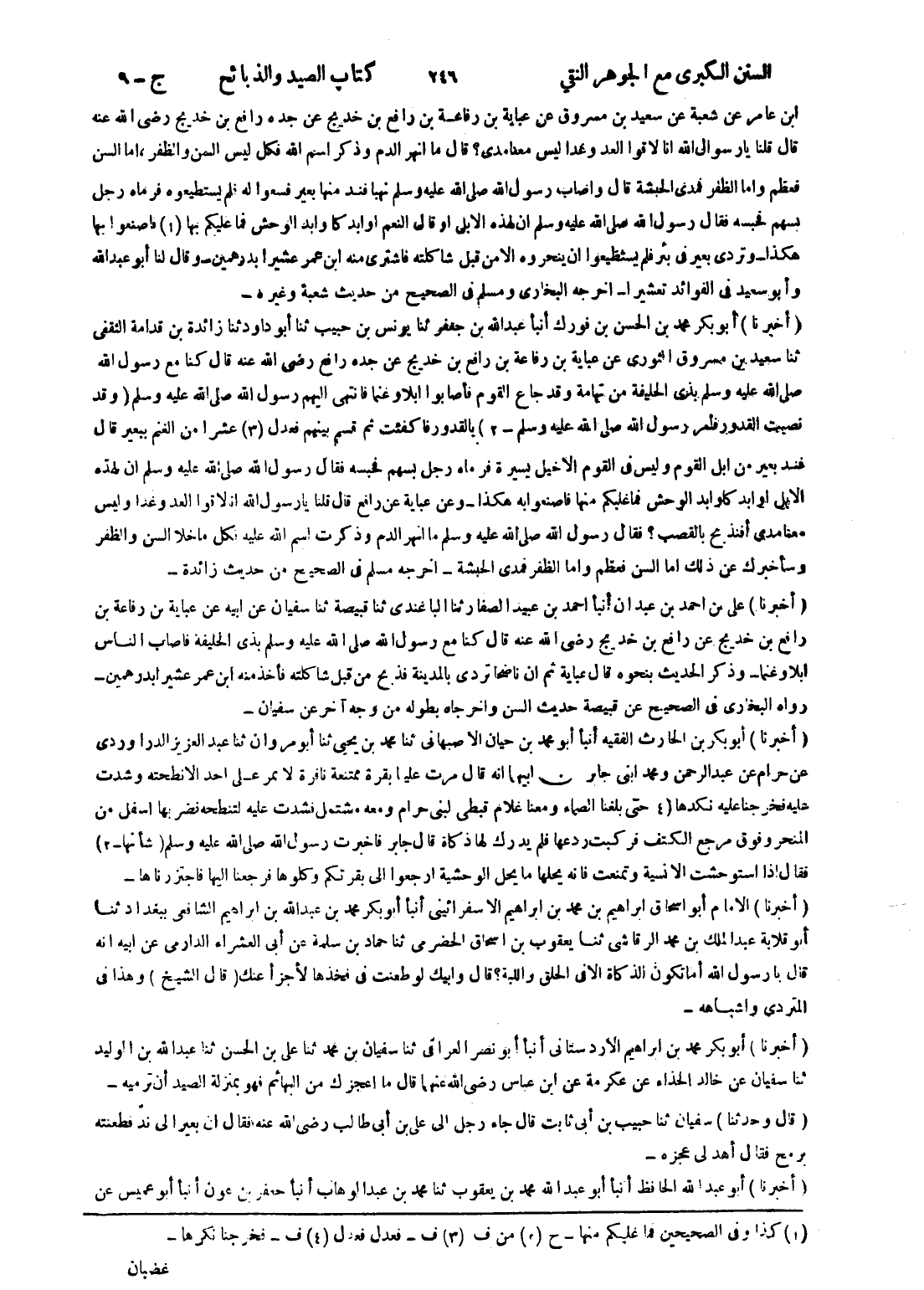 - (أخبرنا) على بن احمد بن عبدان أنبأ احمد بن عبيد الصفار ثنا الباغندى ثنا قبيصة ثنا سفيان عن ابيه عن عباية بن رفاعة بن رافع بن خديج عن رافع بن خديج رضى الله عنه قال كنا مع رسول الله صلى الله عليه وسلم بذى الحليفة فاصاب الناس ابلا وغنما - وذكر الحديث بنحوه قال عباية ثم ان ناضحا تردى بالمدينة فذبح من قبل شاكلته فأخذ منه ابن عمر عشيرا بدرهمين - رواه البخاري في الصحيح عن قبيصة حديث السن واخرجاه بطوله من وجه آخر عن سفيان