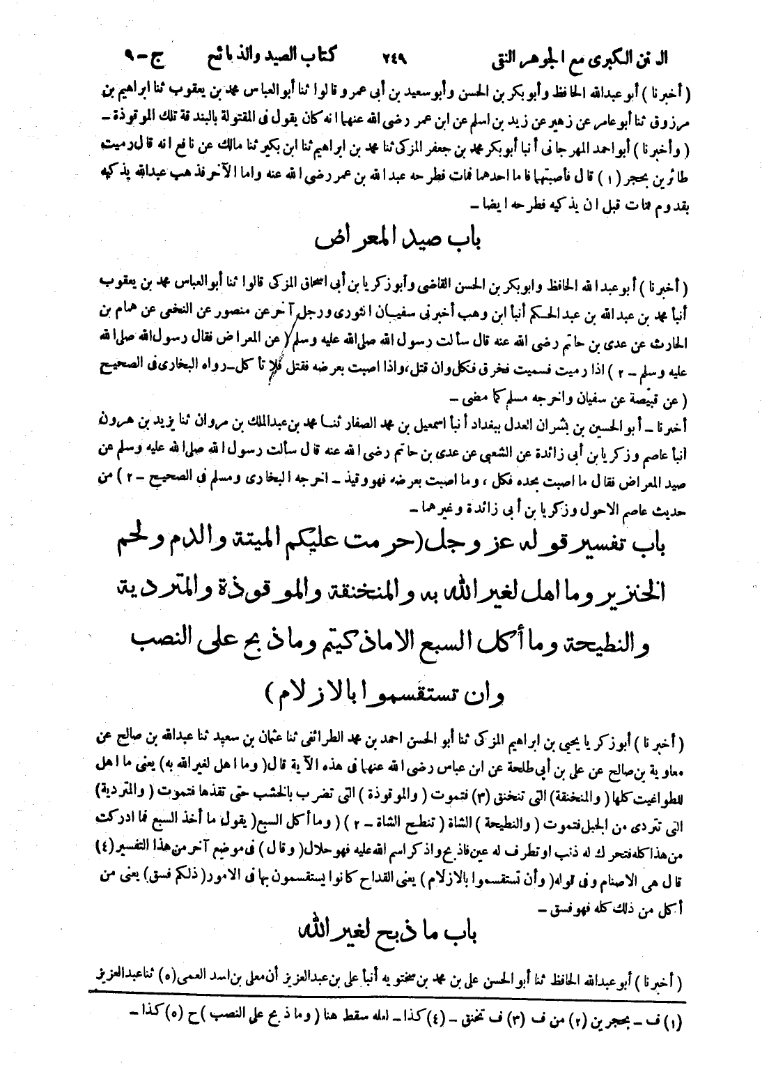 (أخبرنا) أبو عبد الله الحافظ وابو بكر بن الحسن القاضى وأبو زكريا بن أبى اسحاق المزكى قالوا ثنا أبو العباس محمد بن يعقوب أنبأ محمد بن عبد الله بن عبد الحكم أنبأ ابن وهب أخبرني سفيان الثوري ورجل آخر عن منصور عن النخعي عن همام بن الحارث عن عدى بن حاتم رضى الله عنه قال سألت رسول الله صلى الله عليه وسلم (عن المعراض فقال رسول الله صلى الله عليه وسلم - 2) إذا رميت فسميت فخرق فكل وان قتل ، وإذا اصبت بعرضه فقتل فلا تأكل - رواه البخاري في الصحيح (عن قبيصة عن سفيان واخرجه مسلم كما مضى - أخبرنا - أبو الحسين بن بشران العدل ببغداد أنبأ اسمعيل بن محمد الصفار ثنا محمد بن عبد الملك بن مروان ثنا يزيد بن هرون أنبأ عاصم وزكريا بن أبى زائدة عن الشعبى عن عدى بن حاتم رضى الله عنه قال سألت رسول الله صلى الله عليه وسلم عن صيد المعراض فقال ما اصبت بحده فكل ، وما اصبت بعرضه فهو وقيذ - اخرجه البخاري ومسلم في الصحيح - 2) من حديث عاصم الاحول وزكريا بن أبى زائدة وغيرهما - باب تفسير قوله عز وجل (حرمت عليه الميتة والدم ولحم الخنزير وما اهل لغير الله به والمنخنقة والموقوذة والمتردية والنطيحة وما أكل السبع الا ما ذكيتم وما ذبح على النصب وان تستقسموا بالازلام)