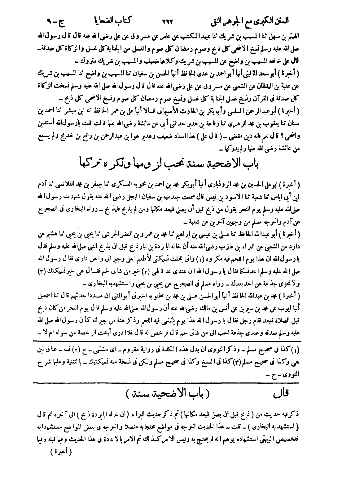 [قال (باب الاضحية سنة) ذكر فيه حديث من (ذبح قبل ان يصلى فليعد مكانها) ثم ذكر حديث البراء (ان خاله ابا بردة ذبح) إلى آخره ثم قال (استشهد به البخاري) - قلت - هذا الحديث اخرجه في مواضع محتجا به متصلا واخرجه في بعض المواضع مستشهدا به فتخصيص البيهقى استشهاده يوهم انه لم يحتج به وليس الامر كذلك ثم الامر بالاعادة في هذا الحديث وفيما قبله وفيما]