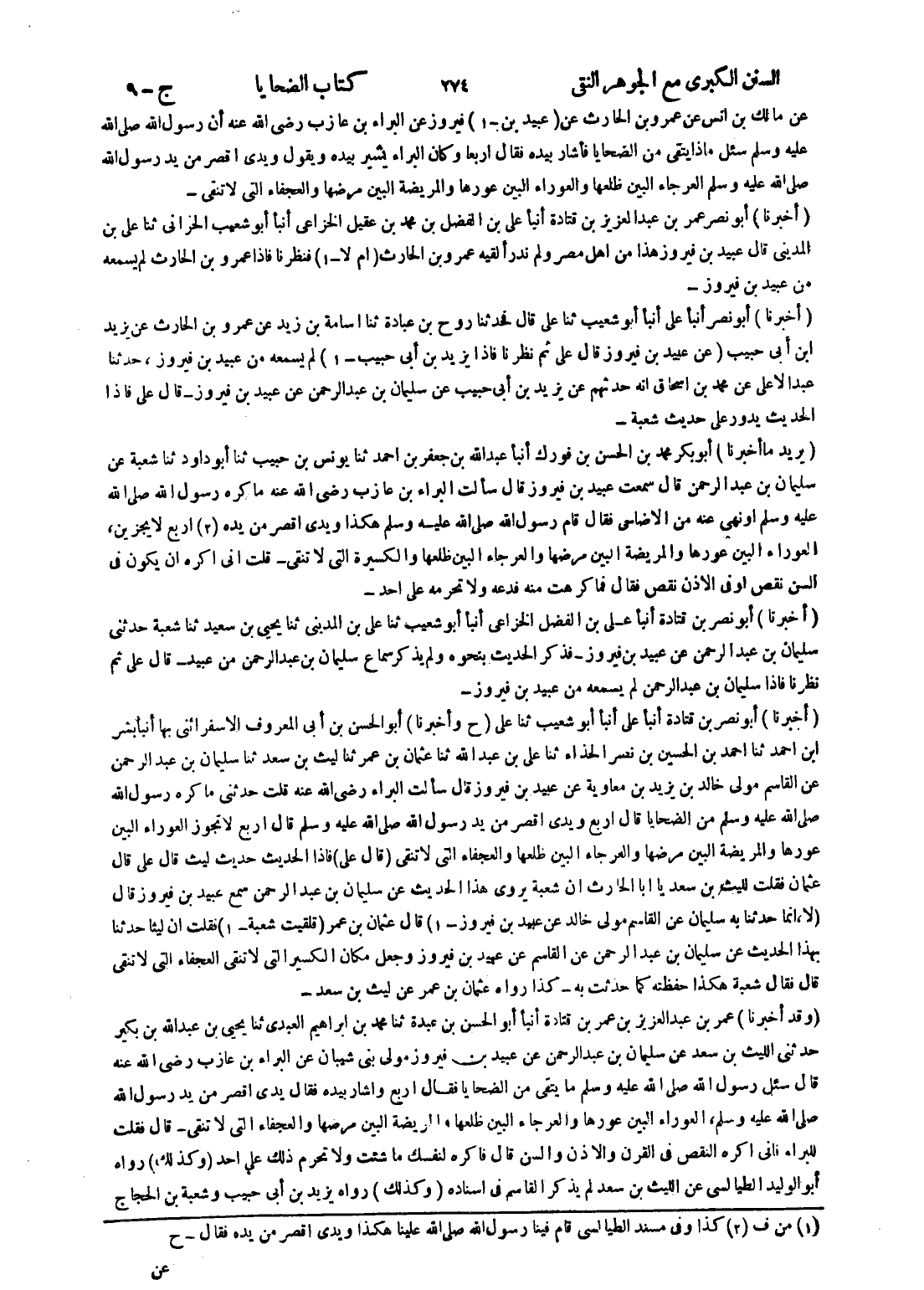(ح وأخبرنا) أبو الحسن بن أبى المعروف الاسفرائنى بها أنبأ بشر ابن احمد ثنا أحمد بن الحسين بن نصر الحذاء ثنا على بن عبد الله ثنا عثمان بن عمر ثنا ليث بن سعد ثنا سليمان بن عبد الرحمن عن القاسم مولى خالد بن يزيد بن معاوية عن عبيد بن فيروز قال سألت البراء رضى الله عنه قلت حدثنى ما كره رسول الله صلى الله عليه وسلم من الضحايا قال اربع ويدى اقصر من يد رسول الله صلى الله عليه وسلم قال اربع لا تجوز العوراء البين عورها والمريضة البين مرضها والعرجاء البين ظلعها والعجفاء التى لا تنقى (قال على) فإذا الحديث حديث ليث قال على قال عثمان فقلت لليث بن سعد يا ابا الحارث ان شعبة يروى هذا الحديث عن سليمان بن عبد الرحمن سمع عبيد بن فيروز قال (لا ، انما حدثنا به سليمان عن القاسم مولى خالد عن عبيد بن فيروز - 1) قال عثمان بن عمر (قلقيت شعبة - 1) فقلت ان ليثا حدثنا بهذا الحديث عن سليمان بن عبد الرحمن عن القاسم عن عبيد بن فيروز وجعل مكان الكسير التى لا تنقى العجفاء التى لا تنقى قال فقال شعبة هكذا حفظته كما حدثت به - كذا رواه عثمان بن عمر عن ليث بن سعد - (وقد أخبرنا) عمر بن عبد العزيز بن عمر بن قتادة أنبأ أبو الحسن بن عبدة ثنا محمد بن ابراهيم العبدى ثنا يحيى بن عبد الله بن بكير