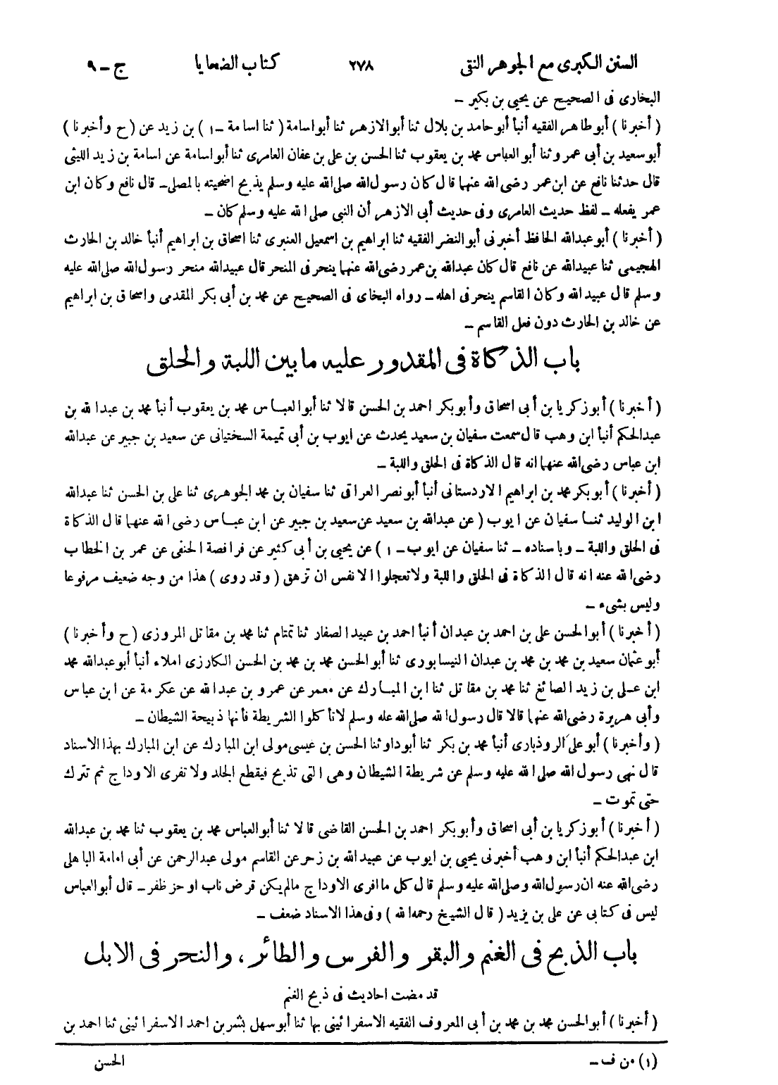- (أخبرنا) أبو بكر محمد بن ابراهيم الاردستانى أنبأ أبو نصر العراقى ثنا سفيان بن محمد الجوهرى ثنا على بن الحسن ثنا عبد الله ابن الوليد ثنا سفيان عن ايوب (عن عبد الله بن سعيد عن سعيد بن جبير عن ابن عباس رضى الله عنهما قال الذكاة في الحلق واللبة - وباسناده - ثنا سفيان عن ايوب - 1) عن يحيى بن أبى كثير عن فرافصة الحنفي عن عمر بن الخطاب رضى الله عنه انه قال الذكاة في الحلق واللبة ولا تعجلوا الانفس ان تزهق (وقد روى) هذا من وجه ضعيف مرفوعا وليس بشئ