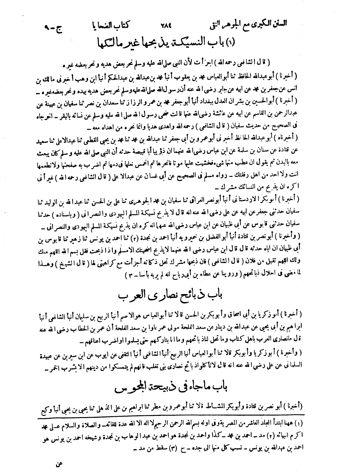 - (أخبرنا) أبو بكر الاردستانى أنبأ أبو نصر العراقى ثنا سفيان بن محمد الجوهرى ثنا على بن الحسن ثنا عبد الله بن الوليد ثنا سفيان حدثنى جعفر عن ابيه عن علي رضي الله عنه انه قال لا يذبح نسيكة المسلم اليهودي والنصراني (وباسناده) حدثنا سفيان حدثنى قابوس عن أبى ظبيان عن ابن عباس رضى الله عنهما انه كره ان يذبح نسيكة المسلم اليهودي والنصراني