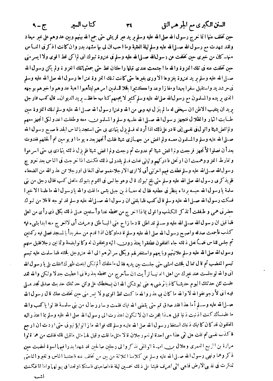حين تخلف عنها انما خرج رسول الله صلى الله عليه وسلم يريد عير قريش جمع الله بينهم وبين عدوهم على غير ميعاد ولقد شهدت مع رسول الله صلى الله عليه وسلم ليلة العقبة وما احب ان لى بها مشهد بدر وان كانت اذكر في الناس منها - كان من خبرى حين تخلفت عن رسول الله صلى الله عليه وسلم في غزوة تبوك انى لم اكن قط اقوى ولا ايسر منى حين تخلفت عنه في تلك الغزوة والله ما اجتمعت عندي قبلها راحلتان قط حتى جمعتهما تلك الغزوة ولم يكن رسول الله صلى الله عليه وسلم يريد غزوة يغزوها الا ورى بغيرها حتى كانت تلك الغزوة غزاها رسول الله صلى الله عليه وسلم في حر شديد واستقبل سفرا بعيدا ومفازا وعدوا كثيرا فجلا للمسلمين امرهم ليتأهبوا اهبة عدوهم واخبرهم بوجهه الذى يريده والمسلمون مع رسول الله صلى الله عليه وسلم كثير لا يجمعهم كتاب حافظ - يريد الديوان - قال كعب فما رجل يريد ان يتغيب الا ظن ان سيخفى له ما لم ينزل فيه وحى من الله وغزا رسول الله صلى الله عليه وسلم تلك الغزوة حين طابت الثمار والظلال فتجهز رسول الله صلى الله عليه وسلم والمسلمون معه وطفقت اغدو لكى اتجهز معهم ولم اقض شيئا واقول في نفسي إنى قادر على ذلك إذا أردته فلم يزل يتمادى بى حتى استجد بالناس الجد فاصبح رسول الله صلى الله عليه وسلم والمسلمون معه ولم اقض من جهازي شيئا فقلت أتجهز بعده يوما أو يومين ثم ألحقهم فغدوت بعد أن فصلوا لاتجهز فرجعت ولم اقض شيئا ثم غدوت ثم رجعت ولم اقض شيئا فلم يزل ذلك يتمادى بى حتى اسرعوا وتفارط الغزو وهممت ان ارتحل فادركهم وليتني فعلت فلم يقدر لى ذلك فكنت إذا خرجت في الناس بعد خروج رسول الله صلى الله عليه وسلم فطفت فيهم احزنني أنى لا ارى الا رجلا مغموصا في النفاق أو رجلا ممن عذر الله من الضعفاء فلم يذكرنى رسول الله صلى الله عليه وسلم حتى بلغ تبوك قال وهو جالس في القوم بتبوك ما فعل كعب فقال رجل من بنى سلمة يارسول الله حبسه برداه ينظر في عطفيه فقال له معاذ بن جبل بئس ما قلت والله يارسول الله ما علمنا الا خيرا فسكت رسول الله صلى الله عليه وسلم قال كعب فلما بلغني ان رسول الله صلى الله عليه وسلم قد توجه قافلا من تبوك حضرني همى وطفقت أتذكر الكذب واقول بماذا اخرج من سخطه غدا وأستعين على ذلك بكل ذى رأى من اهلي فلما قيل ان رسول الله صلى الله عليه وسلم قد اظل قادما زاح عنى الباطل وعرفت أنى لا اخرج منه ابدا بشئ فيه كذب فأجمعت صدقه واصبح رسول الله صلى الله عليه وسلم قادما وكان إذا قدم من سفر بدأ بالمسجد فصلى فيه ركعتين