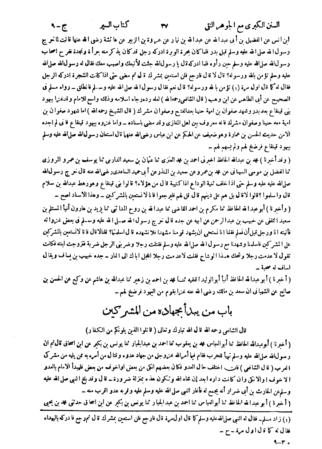 (قال الشافعي رحمه الله) لعله رده رجاء اسلامه وذلك واسع للامام وقد غزا بيهود بنى قينقاع بعد بدر وشهد صفوان بن امية حنينا بعد الفتح وصفوان مشرك (قال الشيخ رحمه الله) اما شهود صفوان بن امية معه حنينا وصفوان مشرك فانه معروف بين اهل المغازى وقد مضى باسناده - واما غزوه بيهود قينقاع فانى لم اجده الا من حديث الحسن بن عمارة وهو ضعيف عن الحكم عن ابن عباس رضى الله عنهما قال استعان رسول الله صلى الله عليه وسلم بيهود قينقاع فرضخ لهم ولم يسهم لهم - (وقد أخبرنا) محمد بن عبد الله الحافظ اخبرني احمد بن محمد العنزي ثنا عثمان بن سعيد الدارمي ثنا يوسف بن عمرو المروزى ثنا الفضل بن موسى السينانى عن محمد بن عمرو عن سعيد بن المنذر عن أبى حميد الساعدي رضى الله عنه قال خرج رسول الله صلى الله عليه وسلم حتى إذا خلف ثنية الوداع إذا كتيبة قال من هؤلاء ؟ قالوا بنى قينقاع وهو رهط عبد الله بن سلام قال واسلموا ؟ قالوا لا قال بل هم على دينهم قال قل لهم فليرجعوا فانا لا نستعين بالمشركين - وهذا الاسناد اصح
