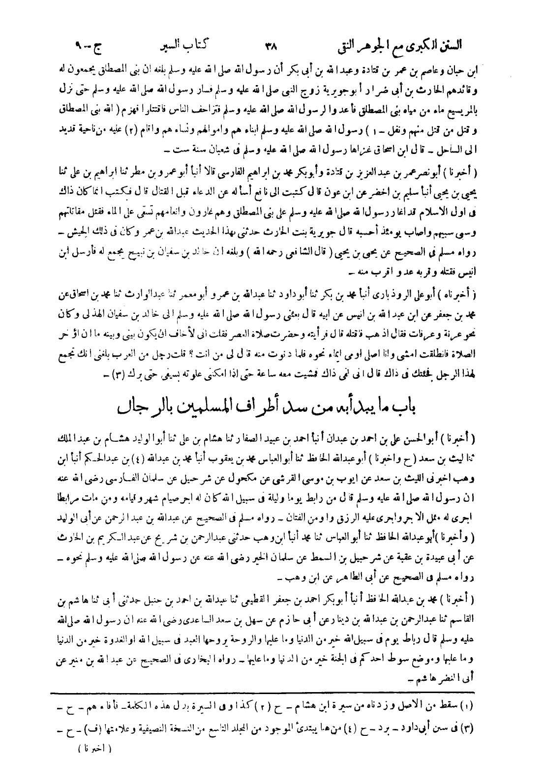 - (أخبرنا) أبو نصر عمر بن عبد العزيز بن قتادة وأبو بكر محمد بن ابراهيم الفارسى قالا أنبأ أبو عمرو بن مطر ثنا ابراهيم بن على ثنا يحيى بن يحيى أنبأ سليم بن اخضر عن ابن عون قال كتبت إلى نافع أسأله عن الدعاء قبل القتال قال فكتب انما كان ذاك في اول الاسلام قد اغار رسول الله صلى الله عليه وسلم على بنى المصطلق وهم غارون وانعامهم تسقى على الماء فقتل مقاتلتهم وسبى سبيهم واصاب يومئذ أحسبه قال جويرية بنت الحارث حدثنى بهذا الحديث عبد الله بن عمر وكان في ذلك الجيش - رواه مسلم في الصحيح عن يحيى بن يحيى