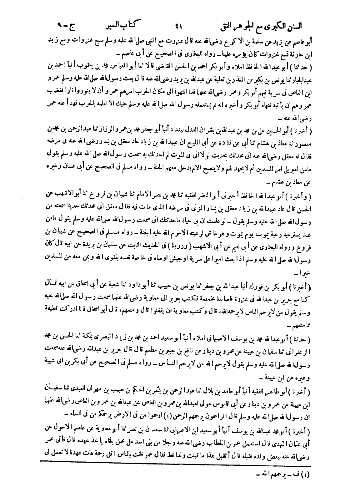 - (أخبرنا) أبو بكر بن فورك أنبأ عبد الله بن جعفر ثنا يونس بن حبيب ثنا أبو داود ثنا شعبة عن أبى اسحاق عن ابيه قال كنا مع جرير بن عبد الله في غزوة فاصابتنا مخمصة فكتب جرير إلى معاوية رضى الله عنهما سمعت رسول الله صلى الله عليه وسلم يقول من لا يرحم الناس لا يرحمه الله ، قال وكتب معاوية ان يقفلوا قال ومتعهم ، قال أبو إسحاق فانا ادركت قطيفة مما متعهم -
