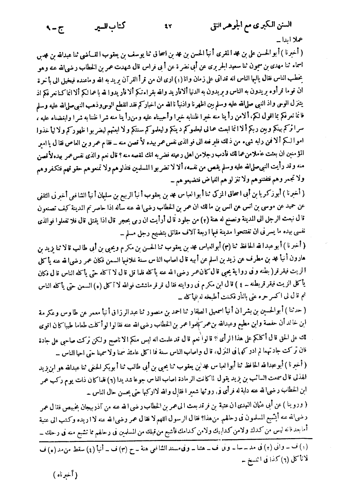 - (أخبرنا) أبو عبد الله الحافظ ثنا (3) أبو العباس محمد بن يعقوب ثنا الحسن بن مكرم ويحيى بن أبى طالب قالا ثنا يزيد بن هارون أنبأ محمد بن مطرف عن زيد بن اسلم عن أبيه قال اصاب الناس سنة غلا فيها السمن فكان عمر رضى الله عنه يأكل الزيت فيقرقر (بطنه وفى رواية يحيى قال كان عمر رضى الله عنه يأكله فلما قل قال لا آكله حتى يأكله الناس قال فكان يأكل الزيت فيقرقر بطنه - 4) قال ابن مكرم في روايته فقال قرقر ما شئت فوالله لا آكل (5) السمن حتى يأكله الناس ثم قال لى اسكر حره عنى بالنار فكنت أطبخه له فيأكله -