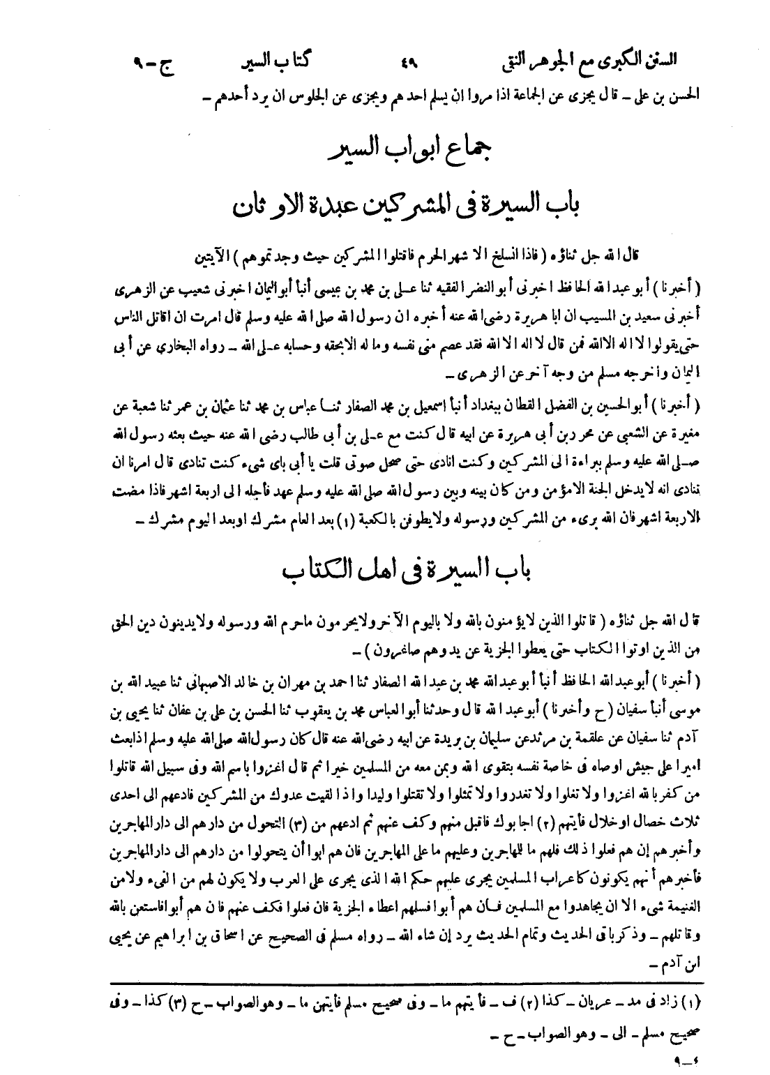- باب السيرة في اهل الكتاب قال الله جل ثناؤه (قاتلوا الذين لا يؤمنون بالله ولا باليوم الآخر ولا يحرمون ما حرم الله ورسوله ولا يدينون دين الحق من الذين اوتوا الكتاب حتى يعطوا الجزية عن يد وهم صاغرون)