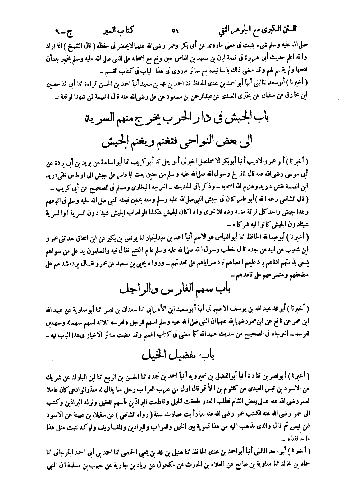 (أخبرنا) أبو نصر بن قتادة أنبأ أبو الفضل بن خميرويه أنبأ احمد بن نجدة ثنا الحسن بن الربيع ثنا ابن المبارك عن شريك عن الاسود بن قيس العبدى عن كلثوم بن الاقمر قال اول من عرب العراب رجل منا يقال له منذر الوادعى كان عاملا لعمر رضى الله عنه على بعض الشام فطلب العدو فلحقت الخيل وتقطعت البراذين فأسهم للخيل وترك البراذين وكتب إلى عمر رضى الله عنه فكتب عمر رضى الله عنه نعما رأيت فصارت سنة (رواه الشافعي) عن سفيان بن عيينة عن الاسود ابن قيس ثم قال والذى نذهب إليه من هذا تسوية بين الخيل والعراب والبراذين والمقاريف ولو كنا نثبت مثل هذا ما خالفناه