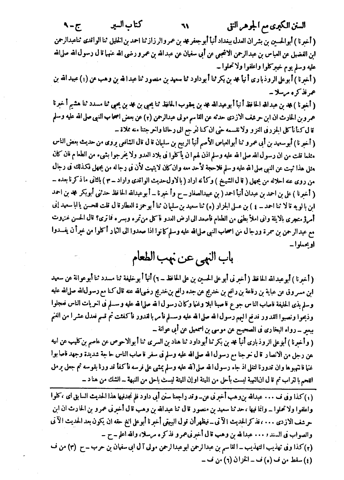 - (وأخبرنا) أبو على الروذبارى أنبأ محمد بن بكر ثنا أبو داود ثنا هناد بن السرى ثنا أبو الأحوص عن عاصم بن كليب عن ابيه عن رجل من الانصار قال خرجنا مع رسول الله صلى الله عليه وسلم في سفر فاصاب الناس حاجة شديدة وجهد فأصابوا غنما فانتهبوها وان قدورنا لتغلى إذ جاء رسول الله صلى الله عليه وسلم يمشى على فرسه فأكفأ قدورنا بقوسه ثم جعل يرمل اللحم بالتراب ثم قال ان النهبة ليست بأحل من الميتة أو إن الميتة ليست باحل من النبهة - الشك من هناد -