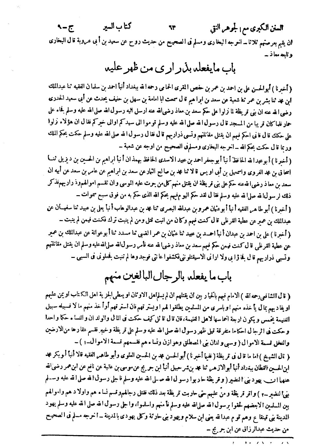 (أخبرنا) أبو الحسن على بن احمد بن عمر بن حفص المقرى الحمامى رحمه الله ببغداد أنبأ احمد بن سلمان الفقيه ثنا عبد الملك ابن محمد ثنا بشر بن عمر ثنا شعبة عن سعد بن ابراهيم قال سمعت ابا امامة بن سهل بن حنيف يحدث عن أبى سعيد الخدرى رضى الله عنه ان بنى قريظة لما نزلوا على حكم سعد بن معاذ رضى الله عنه ارسل إليه رسول الله صلى الله عليه وسلم فجاء على (ار) ؟ فلما كان قريبا من المسجد قال رسول الله صلى الله عليه وسلم قوموا إلى سيدكم أو إلى خيركم فقال ان هؤلاء نزلوا ؟ حكمك قال فانى احكم فيهم ان يقتل مقاتلتهم وتسبى ذراريهم قال فقال رسول الله صلى الله عليه وسلم حكمت بحكم الملك ؟ بما قال حكمت بحكم الله - اخرجه البخاري ومسلم في الصحيح من اوجه عن شعبة