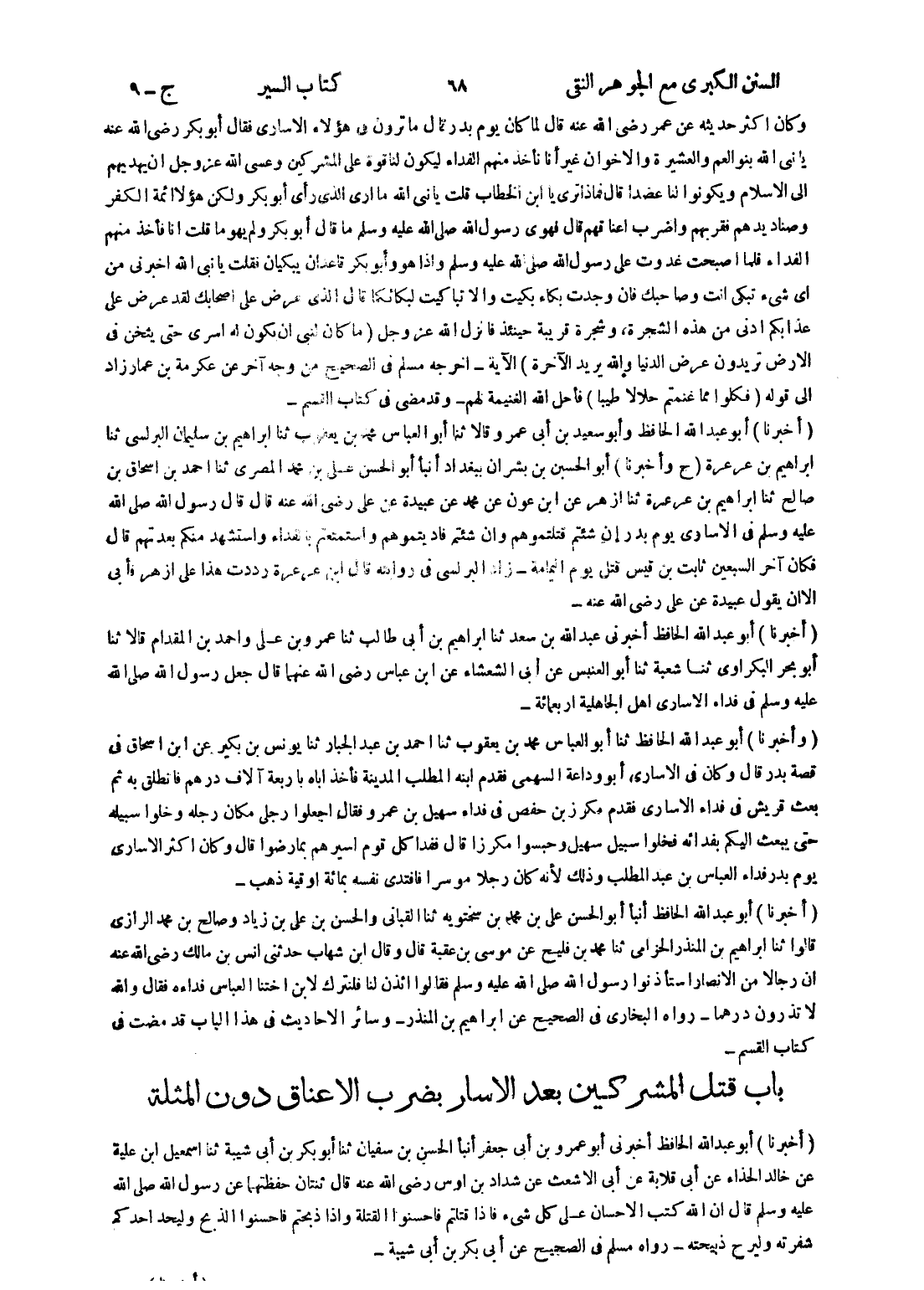 - (أخبرنا) أبو عبد الله الحافظ أنبأ أبو الحسن على بن محمد بن سختويه ثنا القبانى والحسن بن على بن زياد وصالح بن محمد الرازي قالوا ثنا ابراهيم بن المنذر الحزامى ثنا محمد بن فليح عن موسى بن عقبة قال وقال ابن شهاب حدثنى انس بن مالك رضى الله عنه ان رجالا من الانصار استأذنوا رسول الله صلى الله عليه وسلم فقالوا ائذن لنا فلنترك لابن اختنا العباس فداءه فقال والله لا تذرون درهما - رواه البخاري في الصحيح عن ابراهيم بن المنذر - وسائر الاحاديث في هذا الباب قد مضت في كتاب القسم