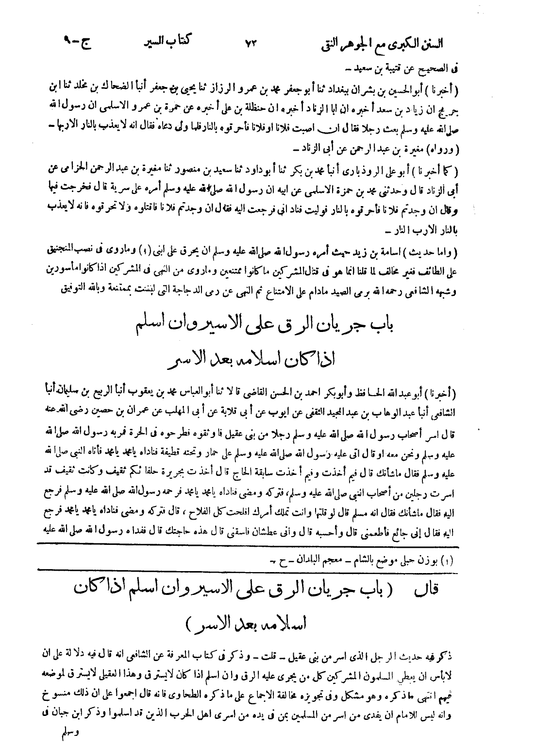 [قال (باب جريان الرق على الاسير وان اسلم إذا كان اسلامه بعد الاسر) ذكر فيه حديث الرجل الذى اسر من بنى عقيل - قلت - وذكر في كتاب المعرفة عن الشافعي انه قال فيه دلالة على ان لا بأس ان يعطى المسلمون المشركين كل من يجرى عليه الرق وان اسلم إذا كان لا يسترق وهذا العقيلى لا يسترق؟ لموضعه فيهم انتهى ما ذكره وهو مشكل وفى تجويزه مخالفة الاجماع على ما ذكره الطحاوي فانه قال اجمعوا على ان ذلك منسوخ وانه ليس للامام ان يفدى من اسر من المسلمين بمن في يده من اسرى امل الحرب الذين قد اسلموا وذكر ابن حبان في]