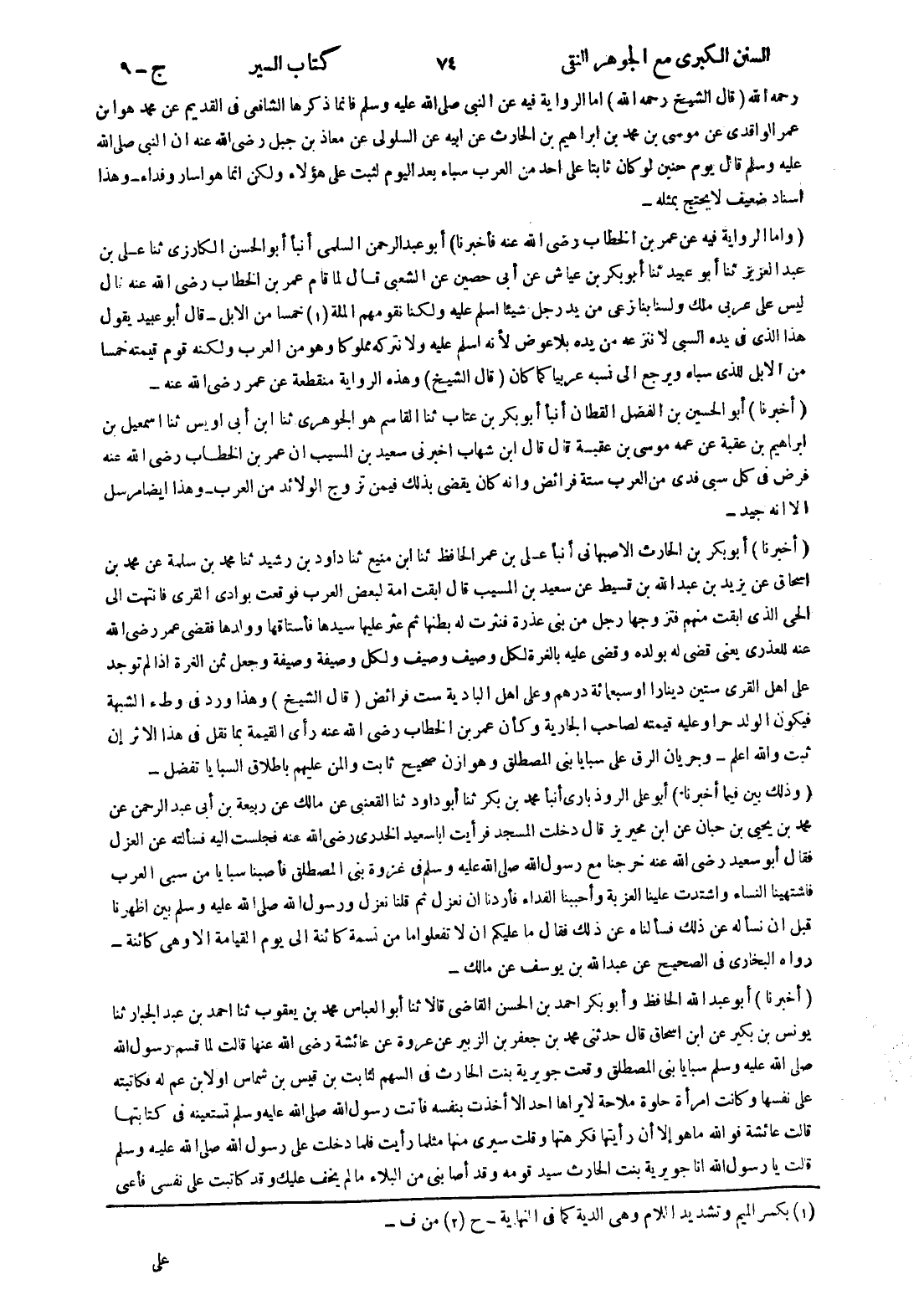 (واما الرواية فيه عن عمر بن الخطاب رضى الله عنه فأخبرنا) أبو عبد الرحمن السلمى أنبأ أبو الحسن الكارزى ثنا على بن عبد العزيز ثنا أبو عبيد ثنا أبو بكر بن عياش عن أبى حصين عن الشعبى قال لما قام عمر بن الخطاب رضى الله عنه قال ليس على عربي ملك ولسنا بنازعى من يد رجل شيئا اسلم عليه ولكنا نقومهم الملة (1) خمسا من الابل - قال أبو عبيد يقول هذا الذى في يده السبى لا ننزعه من يده بلا عوض لانه اسلم عليه ولا نتركه مملوكا وهو من العرب ولكنه قوم قيمته خمسا من الابل للذى سباه ويرجع إلى نسبه عربيا كما كان (قال الشيخ) وهذه الرواية منقطعة عن عمر رضى الله عنه