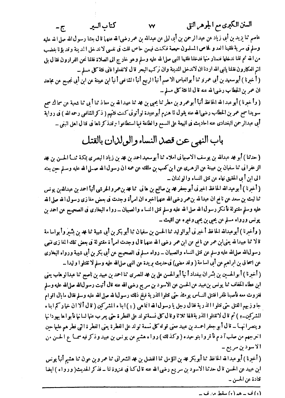 - (وأخبرنا) أبو عبد الله الحافظ أخبرني أبو الوليد ثنا الحسن بن سفيان ثنا أبو بكر بن أبى شيبة ثنا محمد بن بشير وأبو أسامة قالا ثنا عبيد الله يعنى ابن عمر عن نافع عن ابن عمر رضى الله عنهما قال وجدت امرأة مقتولة في بعض تلك المغازى فنهى رسول الله صلى الله عليه وسلم عن قتل النساء والصبيان - رواه مسلم في الصحيح عن أبى بكر بن أبى شيبة ورواه البخاري عن اسحاق بن ابراهيم عن أبى اسامة (وقد مضى) في حديث بريدة عن النبي صلى الله عليه وسلم لا تقتلوا وليدا