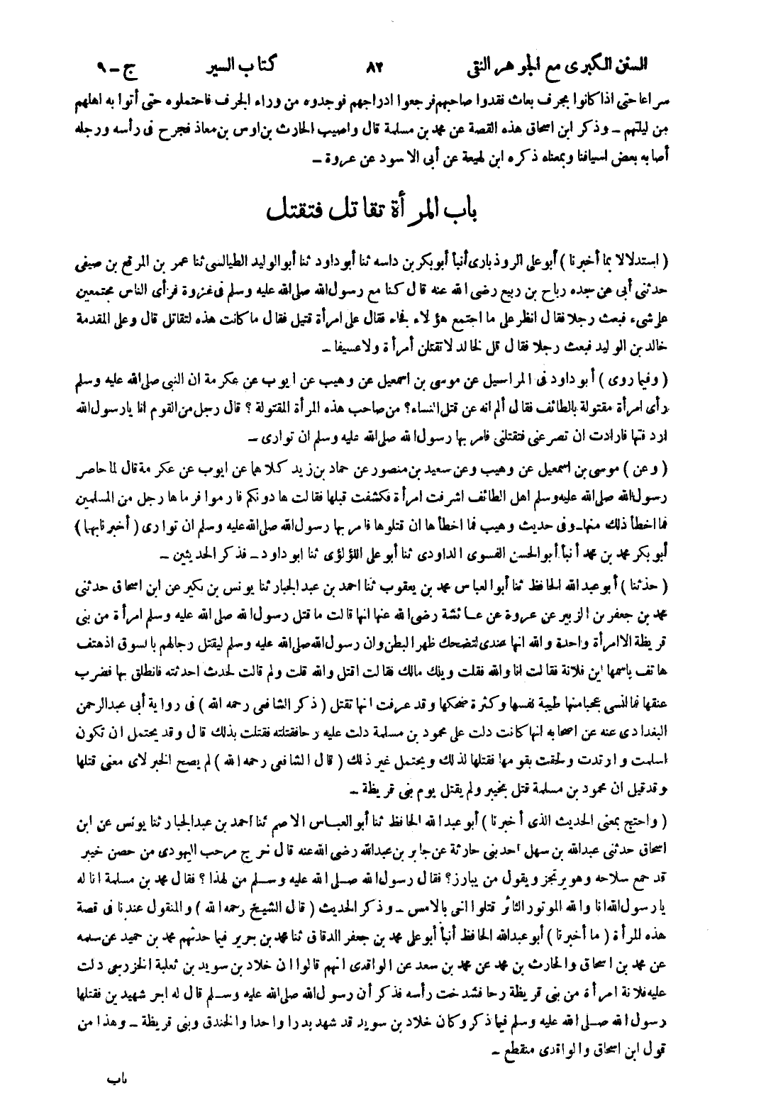 - باب المرأة تقاتل فتقتل (استدلالا بما أخبرنا) أبو على الروذبارى أنبأ أبو بكر بن داسه ثنا أبو داود ثنا أبو الوليد الطيالسي ثنا عمر بن المرقع بن صيفي حدثنى أبى عن جده رباح بن ربيع رضى الله عنه قال كنا مع رسول الله صلى الله عليه وسلم في غزوة فرأى الناس مجتمعين على شئ فبعث رجلا فقال انظر على ما اجتمع هؤلاء فجاء فقال على امرأة قتيل فقال ما كانت هذه لتقاتل قال وعلى المقدمة خالد بن الوليد فبعث رجلا فقال قل لخالد لا تقتلن أمرأة ولا عسيفا - (وفيما روى) أبو داود في المراسيل عن موسى بن اسمعيل عن وهيب عن ايوب عن عكرمة ان النبي صلى الله عليه وسلم رأى امرأة مقتولة بالطائف فقال ألم انه عن قتل النساء ؟ من صاحب هذه المرأة المقتولة ؟ قال رجل من القوم انا يارسول الله اردفتها فارادت ان تصرعنى فتقتلني فامر بها رسول الله صلى الله عليه وسلم ان توارى - (وعن) موسى بن اسمعيل عن وهيب وعن سعيد بن منصور عن حماد بن زيد كلاهما عن ايوب عن عكرمة قال لما حاصر رسول الله صلى الله عليه وسلم اهل الطائف اشرفت امرأة فكشفت قبلها فقالت هادونكم فارموا فرماها رجل من المسلمين فما اخطأ ذلك منها - وفى حديث وهيب فما اخطأها ان قتلوها فامر بها رسول الله صلى الله عليه وسلم ان توارى (أخبرنا بهما) أبو بكر محمد بن محمد أنبأ أبو الحسن الفسوى الداودى ثنا أبو على اللؤلؤي ثنا أبو داود - فذكر الحديثين -