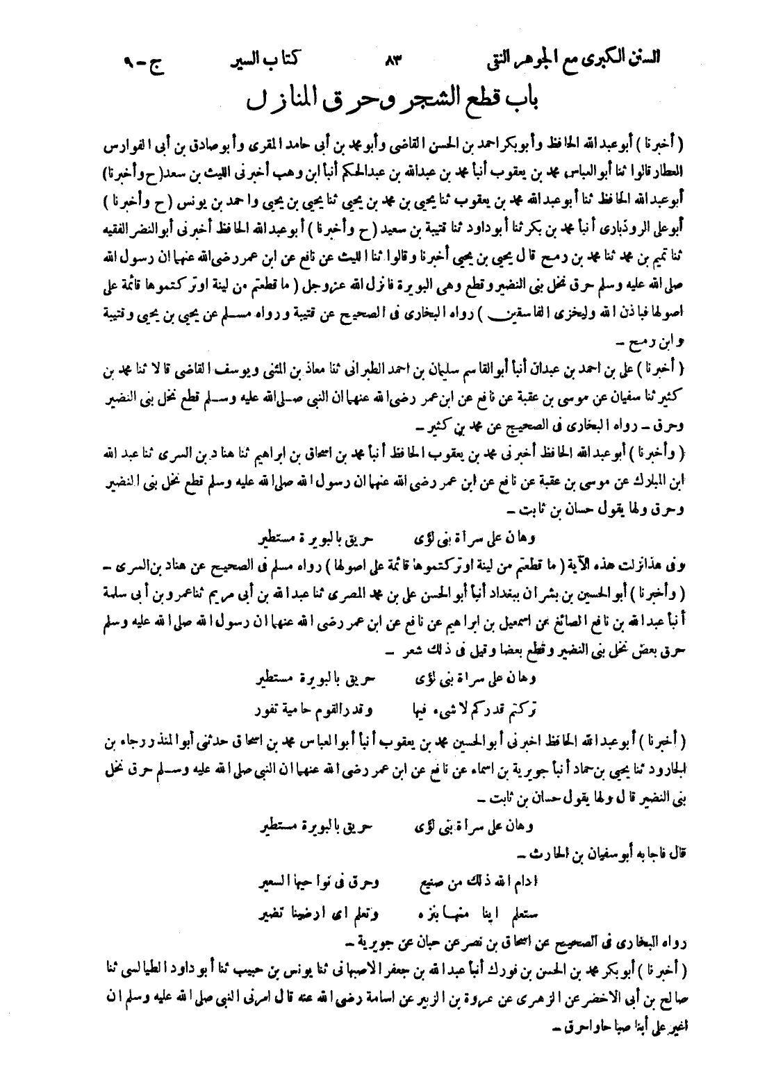 - (وأخبرنا) أبو عبد الله الحافظ أخبرني محمد بن يعقوب الحافظ أنبأ محمد بن اسحاق بن ابراهيم ثنا هناد بن السرى ثنا عبد الله ابن المبارك عن موسى بن عقبة عن نافع عن ابن عمر رضى الله عنهما ان رسول الله صلى الله عليه وسلم قطع نخل بنى النضير وحرق ولها يقول حسان بن ثابت - وهان على سراة بنى لؤى * حريق بالبويرة مستطير وفى هذا نزلت هذه الآية (ما قطعتم من لينة أو تركتموها قائمة على اصولها) رواه مسلم في الصحيح عن هناد بن السرى