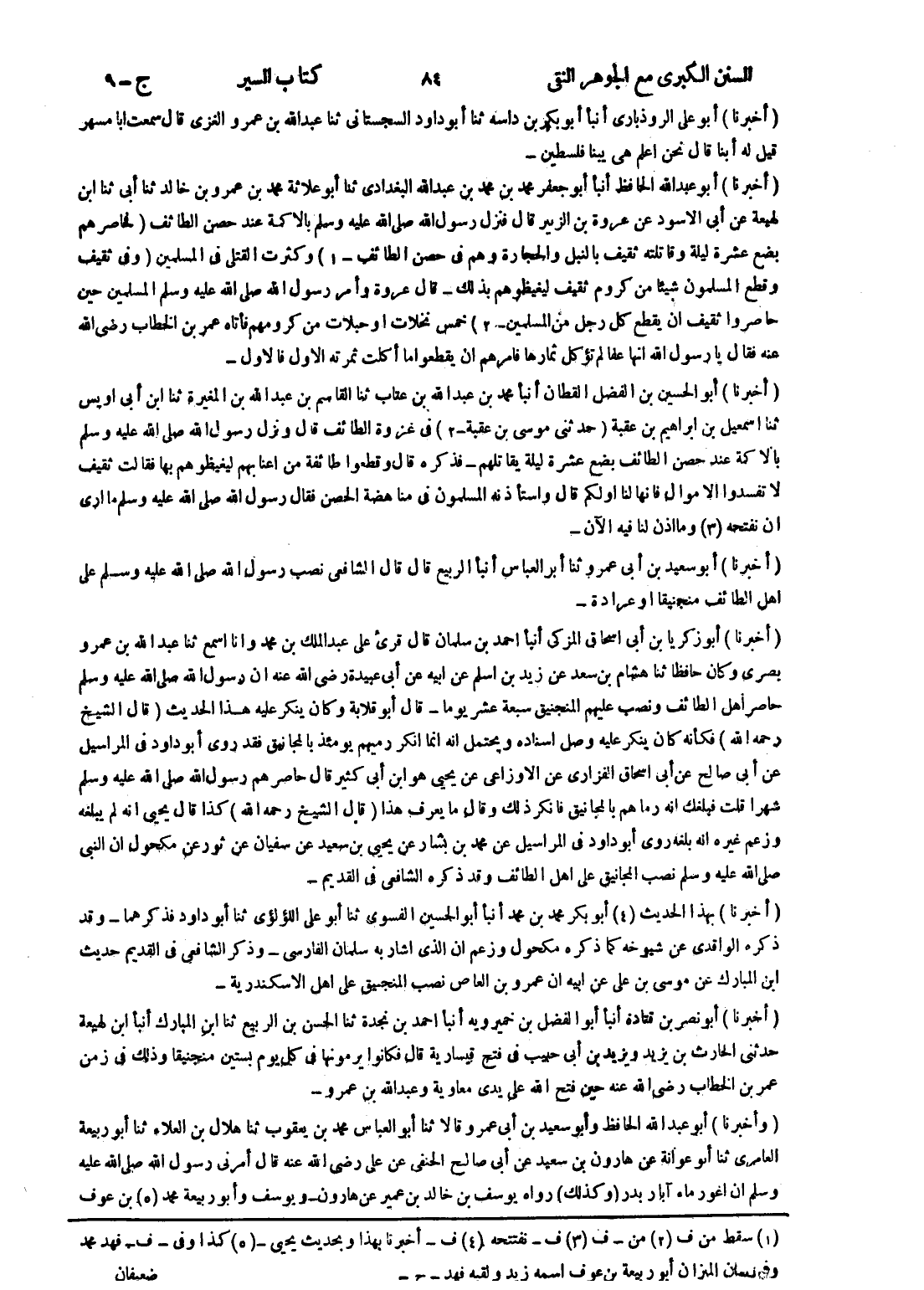 - (أخبرنا) (أبو عبد الله الحافظ أنبأ أبو جعفر محمد بن محمد بن عبد الله البغدادي ثنا أبوعلاثة محمد بن عمرو بن خالد ثنا أبى ثنا ابن لهيعة عن أبى الاسود عن عروة بن الزبير قال فنزل رسول الله صلى الله عليه وسلم بالاكمة عند حصن الطائف (فحاصرهم بضع عشرة ليلة وقاتلته ثقيف بالنبل والحجارة وهم في حصن الطائف - 1) وكثرت القتلى في المسلمين (وفى ثقيف وقطع المسلمون شيئا من كروم ثقيف ليغيظوهم بذلك - قال عروة وأمر رسول الله صلى الله عليه وسلم المسلمين حين حاصروا ثقيف ان يقطع كل رجل من المسلمين - 2) خمس نخلات أو حبلات من كرومهم فأتاه عمر بن الخطاب رضى الله عنه فقال يارسول الله انها عفا لم تؤكل ثمارها فامرهم ان يقطعوا ما أكلت ثمرته الاول فالاول