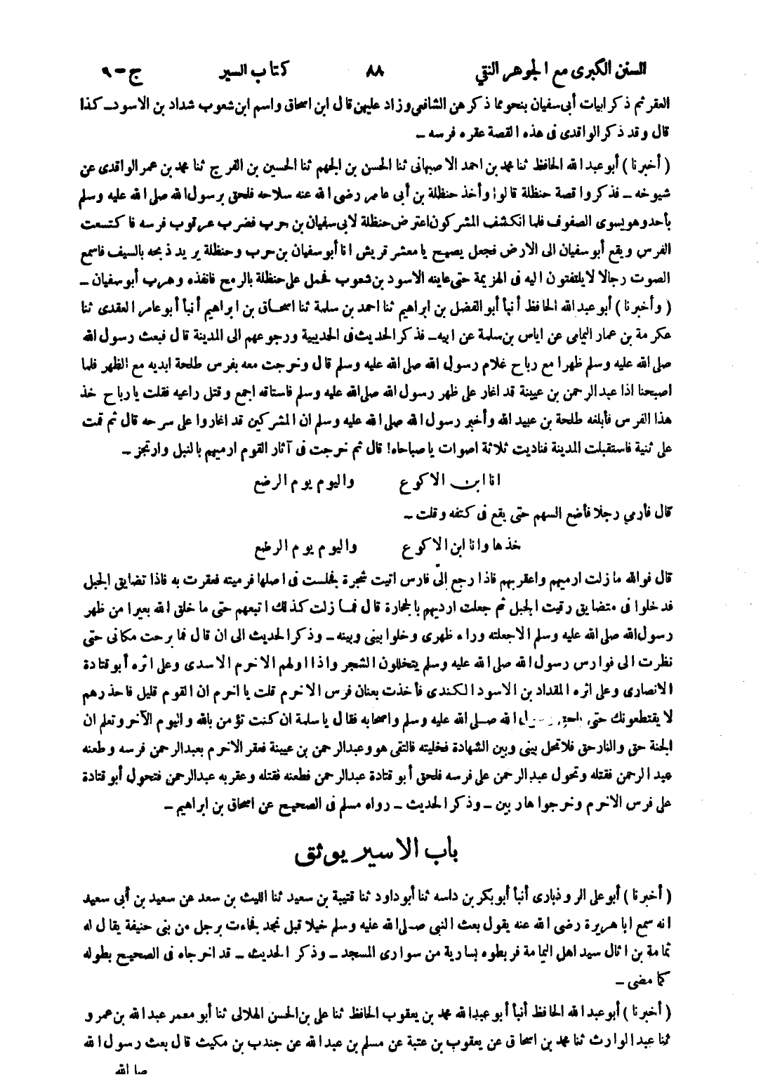 - (أخبرنا) أبو عبد الله الحافظ ثنا محمد بن احمد الاصبهاني ثنا الحسن بن الجهم ثنا الحسين بن الفرج ثنا محمد بن عمر الواقدي عن شيوخه - فذكروا قصة حنظلة قالوا وأخذ حنظلة بن أبى عامر رضى الله عنه سلاحه فلحق برسول الله صلى الله عليه وسلم بأحد وهو يسوى الصفوف فلما انكشف المشركون اعترض حنظلة لابي سفيان بن حرب فضرب عرقوب فرسه فاكتسعت الفرس ويقع أبو سفيان إلى الارض فجعل يصيح يا معشر قريش انا أبو سفيان بن حرب وحنظلة يريد ذبحه بالسيف فاسمع الصوت رجالا لا يلتفتون إليه في الهزيمة حتى عاينه الاسود بن شعوب فحمل على حنظلة بالرمح فانفذه وهرب أبو سفيان