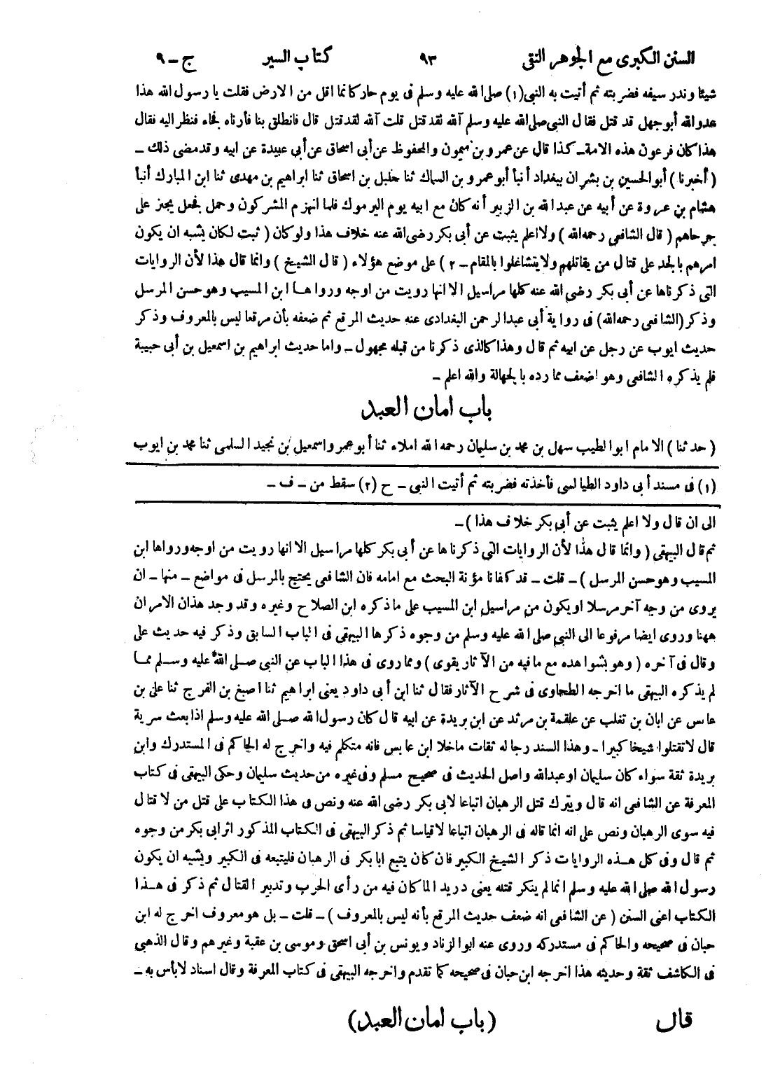 [إلى ان قال ولا اعلم يثبت عن أبى بكر خلاف هذا) - ثم قال البيهقى (وانما قال هذا لان الروايات التى ذكرناها عن أبى بكر كلها مراسيل الا انها رويت من اوجه ورواها ابن المسيب وهو حسن المرسل) - قلت - قد كفانا مؤنة البحث مع امامه فان الشافعي يحتج بالمرسل في مواضع - منها - ان يروى من وجه آخر مرسلا أو يكون من مراسيل ابن المسيب على ما ذكره ابن الصلاح وغيره وقد وجد هذان الامران ههنا وروى ايضا مرفوعا إلى النبي صلى الله عليه وسلم من وجوه ذكرها البيهقى في الباب السابق وذكر فيه حديث على وقال في آخره (وهو بشواهده مع ما فيه من الآثار يقوى) ومما روى في هذا الباب عن النبي صلى الله عليه وسلم مما لم يذكره البيهقى ما اخرجه الطحاوي في شرح الآثار فقال ثنا ابن أبى داود يعنى ابراهيم ثنا اصبغ بن الفرج ثنا على بن عابس عن ابان بن تغلب عن علقمة بن مرثد عن ابن بريدة عن ابيه قال كان رسول الله صلى الله عليه وسلم إذا بعث سرية قال لا تقتلوا شيخا كبيرا - وهذ السند رجاله ثقات ما خلا ابن عابس فانه متكلم فيه واخرج له الحاكم في المستدرك وابن بريدة ثقة سواء كان سليمان أو عبد الله واصل الحديث في صحيح مسلم وفى غيره من حديث سليمان وحكى البيهقى في كتاب المعرفة عن الشافعي انه قال ويترك قتل الرهبان اتباعا لابي بكر رضى الله عنه ونص في هذا الكتاب على قتل من لا قتال فيه سوى الرهبان ونص على انه انما قاله في الرهبان اتباعا لا قياسا ثم ذكر البيهقى في الكتاب المذكور اثر ابى بكر من وجوه ثم قال وفى كل هذه الروايات ذكر الشيخ الكبير فان كان يتبع ابا بكر في الرهبان فليتبعه في الكبير ويشبه ان يكون رسول الله صلى الله عليه وسلم انما لم ينكر قتله يعنى دريدا لما كان فيه من رأى الحرب وتدبير القتال ثم ذكر في هذا الكتاب اعني السنن (عن الشافعي انه ضعف حديث المرقع بأنه ليس بالمعروف) - قلت - بل هو معروف اخرج له ابن حبان في صحيحه والحاكم في مستدركه وروى عنه أبو الزناد ويونس بن أبى اسحق وموسى بن عقبة وغيرهم وقال الذهبي في الكاشف ثقة وحديثه هذا اخرجه ابن حبان في صحيحه كما تقدم واخرجه البيهقى في كتاب المعرفة وقال اسناد لا بأس به - قال (باب امام العبد) ]