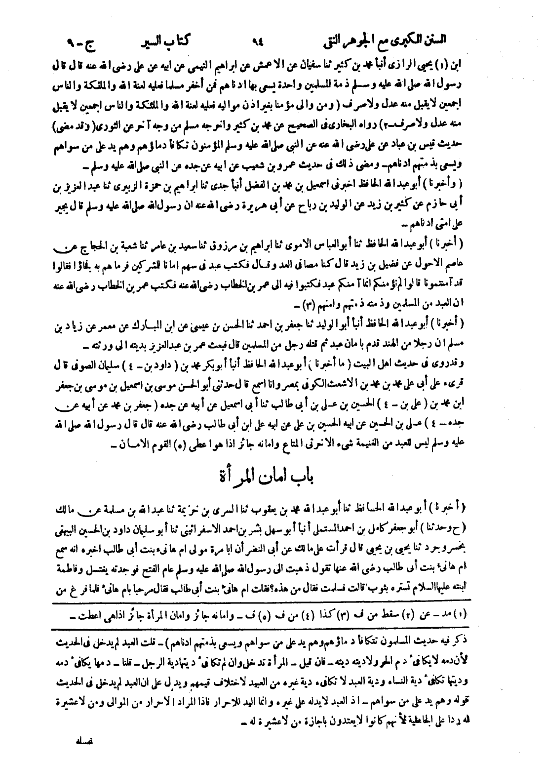 [ذكر فيه حديث المسلمون تتكافأ دماؤهم وهم يد على من سواهم ويسعى بذمتهم ادناهم) - قلت العبد لم يدخل في الحديث لان دمه لا يكافئ دم الحر ولا ديته ديته - فان قيل - المرأة تدخل وان لم تكافئ ديتها دية الرجل - قلنا - دمها يكافئ دمه وديتها تكافئ دية النساء ودية العبد لا تكافئ دية غيره من العبيد لاختلاف قيمهم ويدل على ان العبد لم يدخل في الحديث