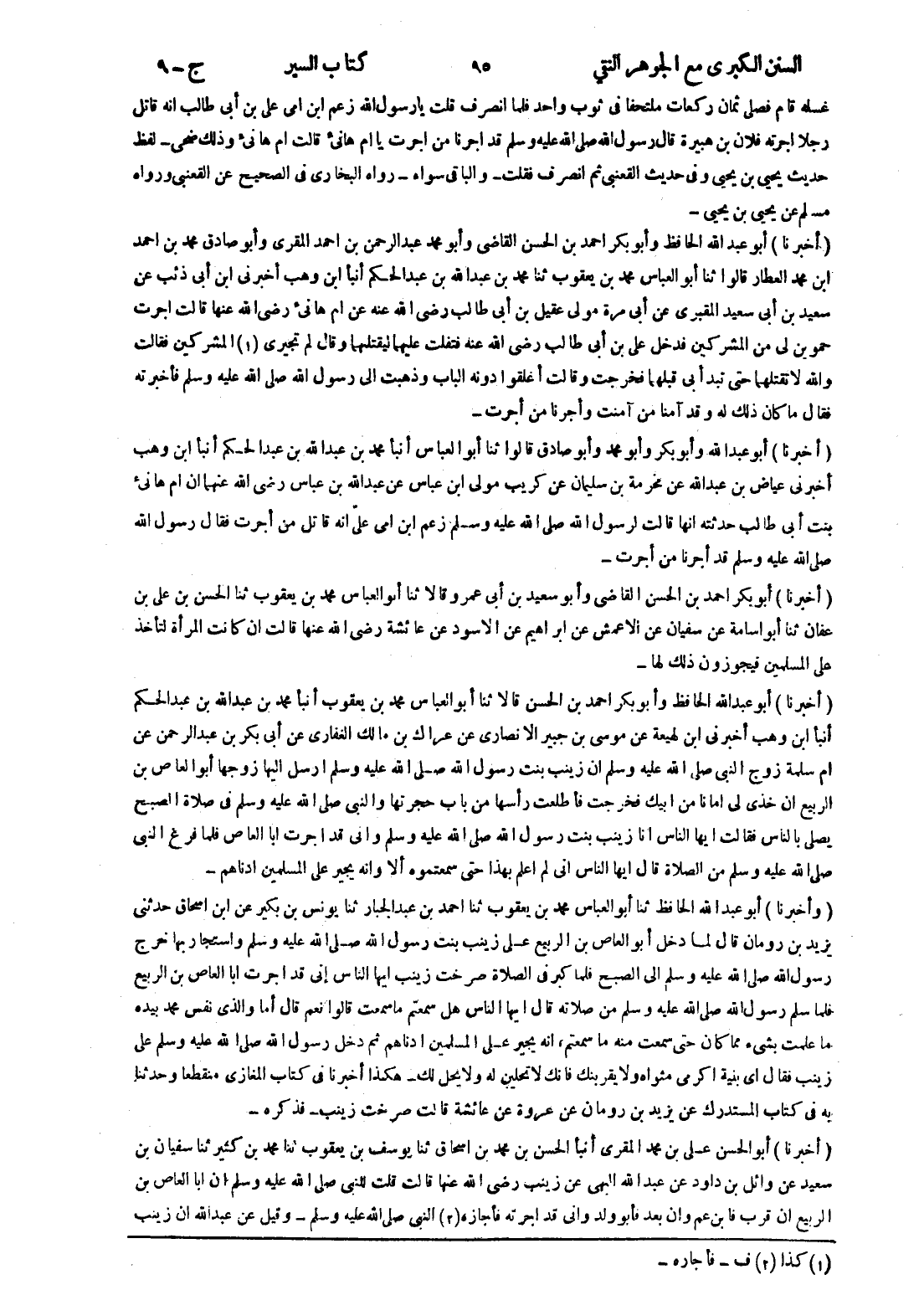 - (أخبرنا) أبو الحسن على بن محمد المقرى أنبأ الحسن بن محمد بن اسحاق ثنا يوسف بن يعقوب ثنا محمد بن كثير ثنا سفيان بن سعيد عن وائل بن داود عن عبد الله البهى عن زينب رضى الله عنها قالت قلت للنبى صلى الله عليه وسلم ان ابا العاص بن الربيع ان قرب فابن عم وان بعد فأبو ولد وانى قد اجرته فأجازه (2) النبي صلى الله عليه وسلم - وقيل عن عبد الله ان زينب