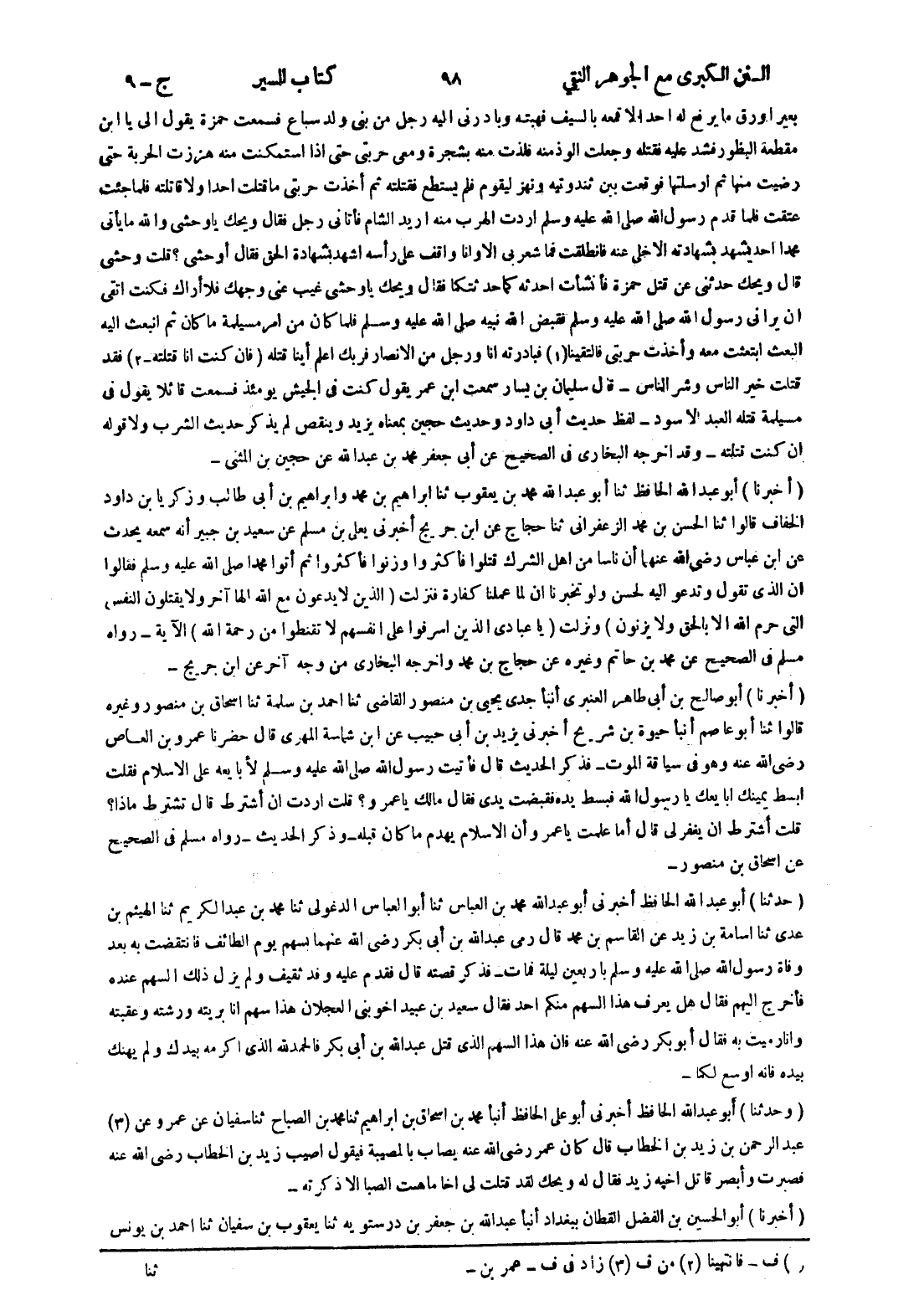 بعيرا ورق ما يرفع له احد الا قمعه بالسيف فهبته وبادرني إليه رجل من بنى ولد سباع فسمعت حمزة يقول إلى يا ابن مقطعة البظور فشد عليه فقتله وجعلت الوذ منه فلذت منه بشجرة ومعى حربتى حتى إذا استمكنت منه هززت الحربة حتى رضيت منها ثم ارسلتها فوقعت بين ثندوتيه ونهز ليقوم فلم يستطع فقتلته ثم أخذت حربتى ما قتلت احدا ولا قاتلته فلما جئت عتقت فلما قدم رسول الله صلى الله عليه وسلم اردت الهرب منه اريد الشام فأتاني رجل فقال ويحك يا وحشى والله ما يأتي محمدا احد يشهد بشهادته الا خلى عنه فانطلقت فما شعر بى الا وانا واقف على رأسه اشهد بشهادة الحق فقال أوحشي ؟ قلت وحشى قال ويحك حدثنى عن قتل حمزة فأنشأت احدثه كما حدثتكما فقال ويحك يا وحشى غيب عنى وجهك فلا أراك فكنت اتقى ان يرانى رسول الله صلى الله عليه وسلم فقبض الله نبيه صلى الله عليه وسلم فلما كان من امر مسيلمة ما كان ثم انبعث إليه البعث ابتعثت معه وأخذت حربتى فالتقينا (1) فبادرته انا ورجل من الانصار فربك اعلم أينا قتله (فان كنت انا قتلته - 2) فقد قتلت خير الناس وشر الناس - قال سليمان بن يسار سمعت ابن عمر يقول كنت في الجيش يومئذ فسمعت قائلا يقول في مسيلمة قتله العبد الاسود - لفظ حديث أبى داود وحديث حجين بمعناه يزيد وينقص لم يذكر حديث الشرب ولا قوله ان كنت قتلته - وقد اخرجه البخاري في الصحيح عن أبى جعفر محمد بن عبد الله عن حجين بن المثنى
