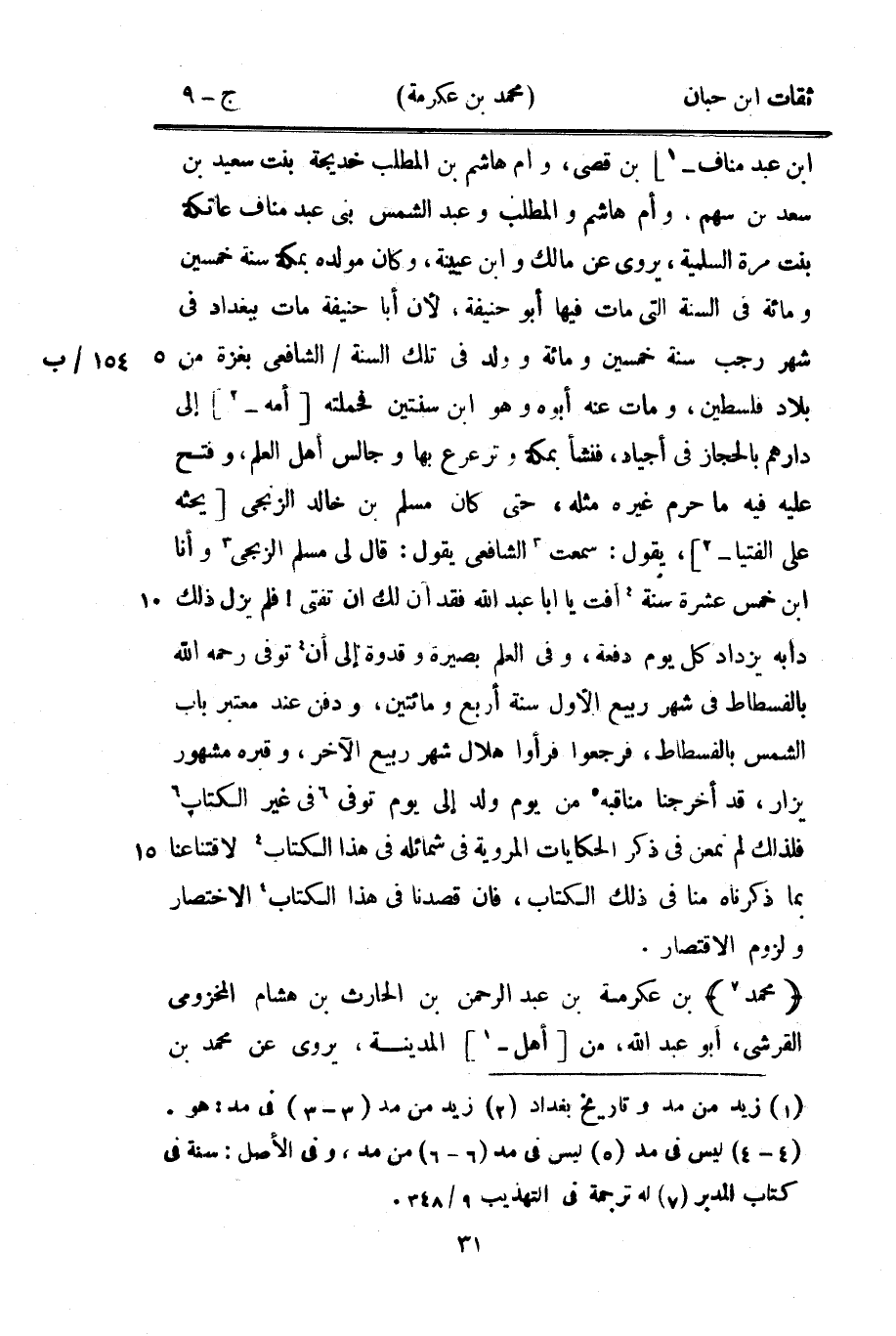 بن قصي وَأم هَاشم بن الْمطلب خَدِيجَة بنت سعيد بن سعد بن سهم وَأم هَاشم وَالْمطلب وَعبد الشَّمْس بنى عبد منَاف عَاتِكَة بنت مرّة السلمِيَّة يروي عَن مَالك وَابْن عُيَيْنَة وَكَانَ مولده بِمَكَّة سنة خمسين وَمِائَة فِي السّنة الَّتِي مَاتَ فِيهَا أَبُو حنيفَة لِأَن أَبَا حنيفَة مَاتَ بِبَغْدَاد فِي شهر رَجَب سنة خمسين وَمِائَة وَولد فِي تِلْكَ السّنة الشَّافِعِي بغزة من بِلَاد فلسطين وَمَات عَنهُ أَبوهُ وَهُوَ بن سنتَيْن فَحَملته أمه إِلَى دَارهم بالحجاز فِي أجياد فَنَشَأَ بِمَكَّة وترعرع بهَا وجالس أهل الْعلم وَفتح عَلَيْهِ فِيهِ مَا حرم غَيره مثله حَتَّى كَانَ مُسلم بن خَالِد الزنْجِي يحثه على الْفتيا يَقُول سَمِعت الشَّافِعِي يَقُول قَالَ لي مُسلم الزنْجِي وَأَنا بن خمس عشرَة سنة أفت يَا أَبَا عبد الله فقد آن لَك ان تفتى فَلم يزل ذَلِك دأبه يزْدَاد كل يَوْم دفْعَة وَفِي الْعلم بَصِيرَة وقدوة إِلَى أَن توفّي رَحمَه الله بالفسطاط فِي شهر ربيع الأول سنة أَربع وَمِائَتَيْنِ وَدفن عِنْد مُعْتَبر بَاب الشَّمْس بالفسطاط فَرَجَعُوا فَرَأَوْا هِلَال شهر ربيع الآخر وقبره مَشْهُور يزار قد أخرجنَا مناقبه من يَوْم ولد إِلَى يَوْم توفّي فِي غير الْكتاب فَلذَلِك لم نمعن فِي ذكر الحكايات المروية فِي شمائله فِي هَذَا الْكتاب لاقتناعنا بِمَا ذَكرْنَاهُ منا فِي ذَلِك الْكتاب فان قصدنا فِي هَذَا الْكتاب الِاخْتِصَار وَلُزُوم الِاقْتِصَار