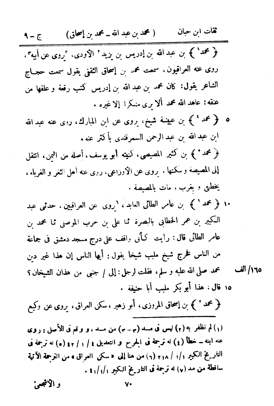 15237 - مُحَمَّد بن عَامر الطَّائِي العابد يروي عَن الْعِرَاقِيّين حَدثنِي عبد الْكَبِير بن عمر الْخطابِيّ بِالْبَصْرَةِ ثَنَا عَليّ بن حَرْب الْموصِلِي ثَنَا مُحَمَّد بن عَامر الطَّائِي قَالَ رَأَيْت كَأَنِّي وَاقِف على درج مَسْجِد دمشق فِي جمَاعَة من النَّاس فَخرج شيخ ملبب شَيخا يَقُول أَيهَا النَّاس إِن هَذَا غير دين مُحَمَّد صَلَّى اللَّهُ عَلَيْهِ وَسَلَّمَ فَقلت لرجل إِلَى جَنْبي من هَذَانِ الشَّيْخَانِ قَالَ هَذَا أَبُو بكر ملبب أَبَا حنيفَة