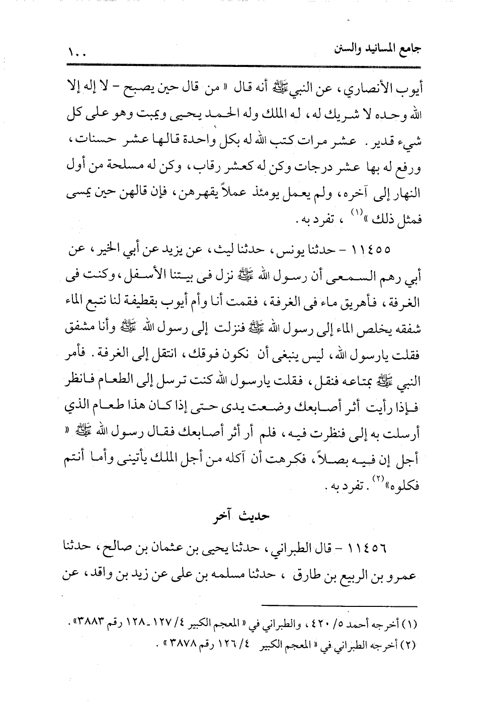 أيوب الأنصارى، عن النبى - صلى الله عليه وسلم - أنه قال «من قال حين يصبح ـ لا إله إلا الله وحده لا شريك له، له الملك وله الحمد يحيى ويميت وهو على كل شىء قدير. عشر مرات كتب الله له بكل واحدة قالها عشر حسنات، ورفع له بها عشر درجات وكن له كعشر رقاب، وكن له مسلحة من أول النهار إلى آخره، ولم يعمل يومئذ عملاً يقهرهن، فإن قالهن حين يمسى فمثل ذلك» (¬1) ، تفرد به.