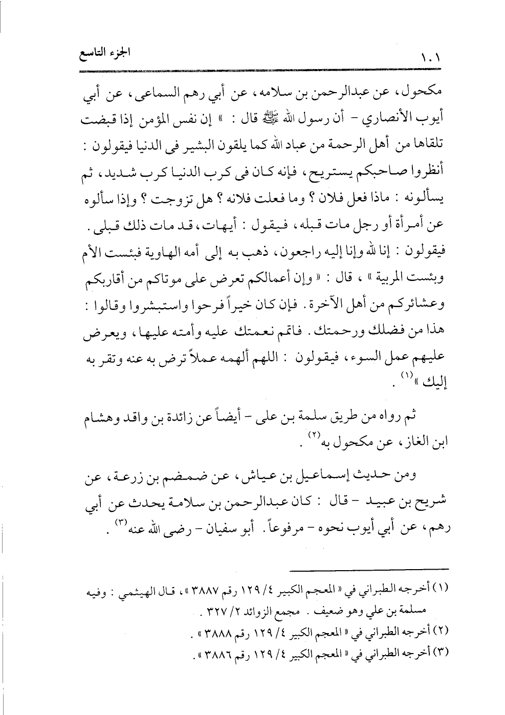 مكحول، عن عبد الرحمن بن سلامة، عن أبى رهم السماعى، عن أبى أيوب الأنصارى ـ أن رسول الله - صلى الله عليه وسلم - قال: «إن نفس المؤمن إذا قبضت تلقاها من أهل الرحمة من عباد الله كما يلقون البشير فى الدنيا فيقولون: أنظروا صاحبكم يستريح، فإنه كان فى كرب الدنيا كرب شديد، ثم يسألونه: ماذا فعل فلان؟ وما فعلت فلانه؟ هل تزوجت؟ وإذا سألوه عن امرأة أو رجل مات قبله، فيقول: أيهات، قد مات ذلك قبلى. فيقولون: إنا لله وإنا إليه راجعون، ذهب به إلى أمه الهاوية فبئست الأم وبئست المربية» ، قال: «وإن أعمالكم تعرض على موتاكم من أقاربكم وعشائركم من أهل الآخرة. فإن كان خيرًا فرحوا واستبشروا وقالوا: هذا من فضلك ورحمتك. فاتمم نعمتك عليه وأمته عليها، ويعرض عليهم عمل السوء، فيقولون: اللهم ألهمه عملاً ترض به عنه وتقربه إليك» (¬1) .