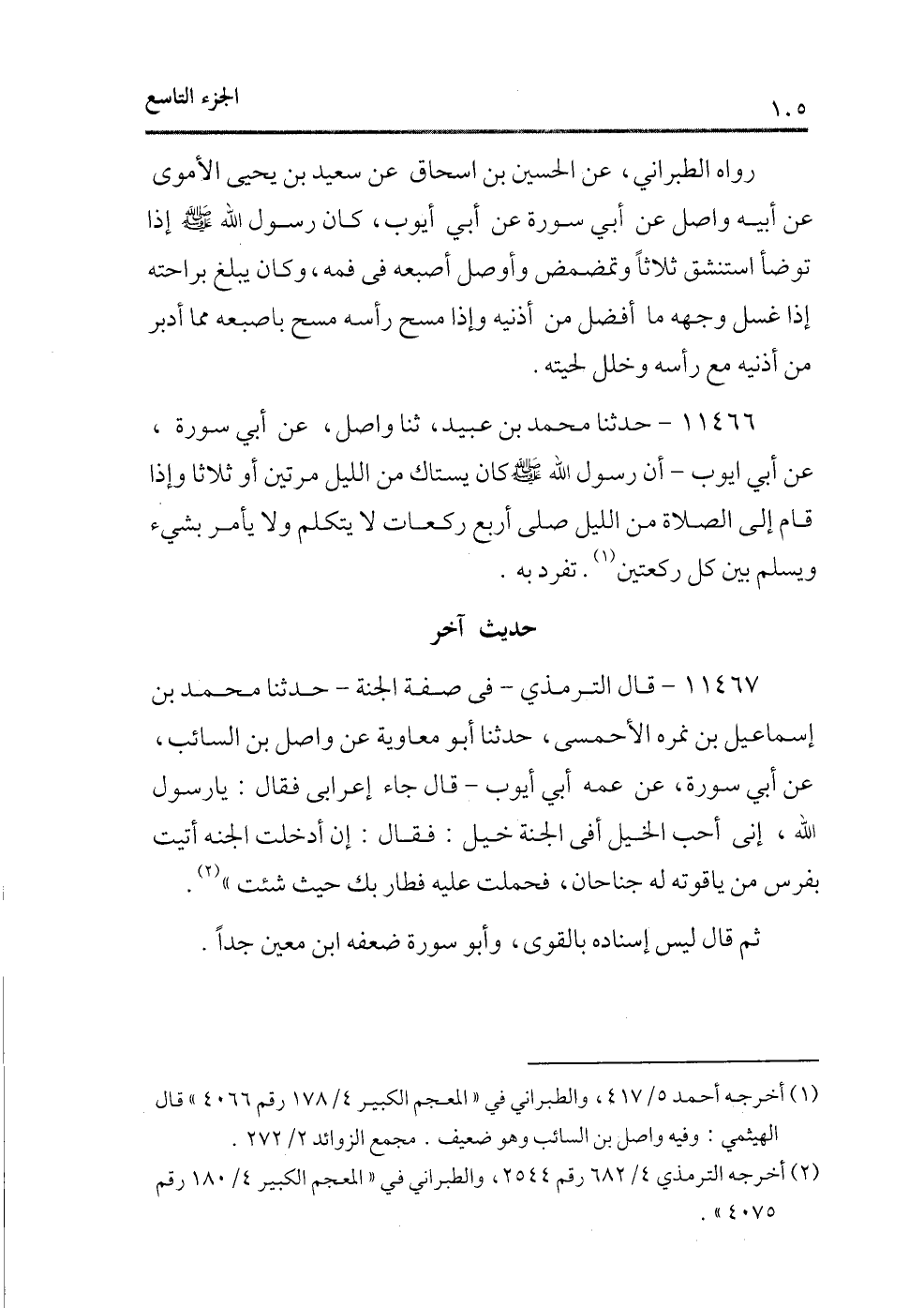 11467 - قال الترمذى ـ فى صفة الجنة ـ حدثنا محمد بن إسماعيل بن نمرة الأحمسى، حدثنا أبو معاوية عن واصل بن السائب، عن أبى سورة، عن عمه أبى أيوب ـ قال جاء إعرابى فقال: يا رسول الله، إنى أحب الخيل أفى الجنة خيل: فقال: إن أدخلت الجنة أتيت بفرس من ياقوته له جناحان، فحملت عليه فطار بك حيث شئت (¬2) .