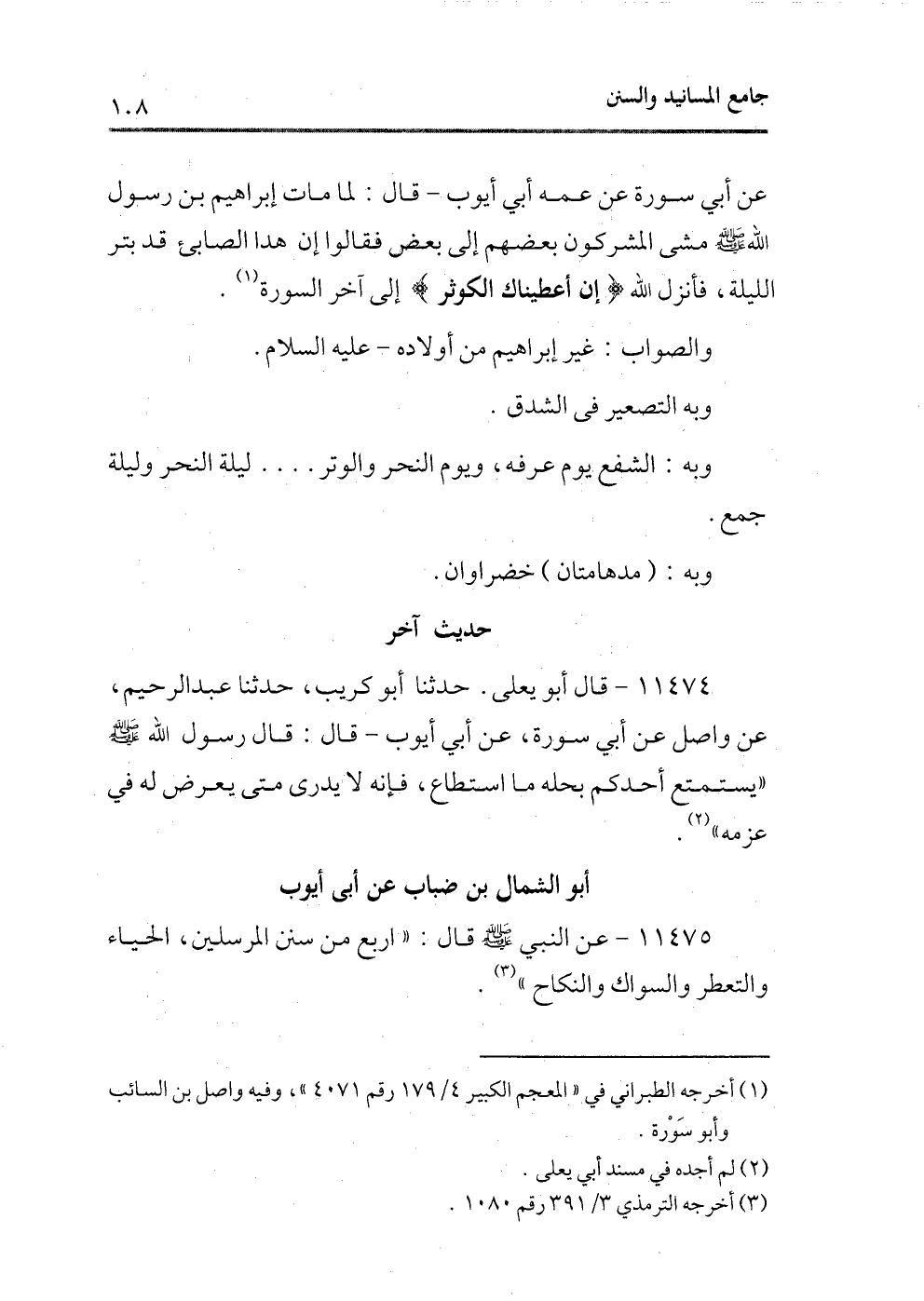 عن أبى سورة عن عمه أبى أيوب ـ قال: لما مات إبراهيم بن رسول الله - صلى الله عليه وسلم - مشى المشركون بعضهم إلى بعض فقالوا إن هذا الصابئ قد بتر الليلة، فأنز الله {إِنَّا أَعْطَيْنَاكَ الْكَوْثَرَ} إلى آخر السورة (¬1) .