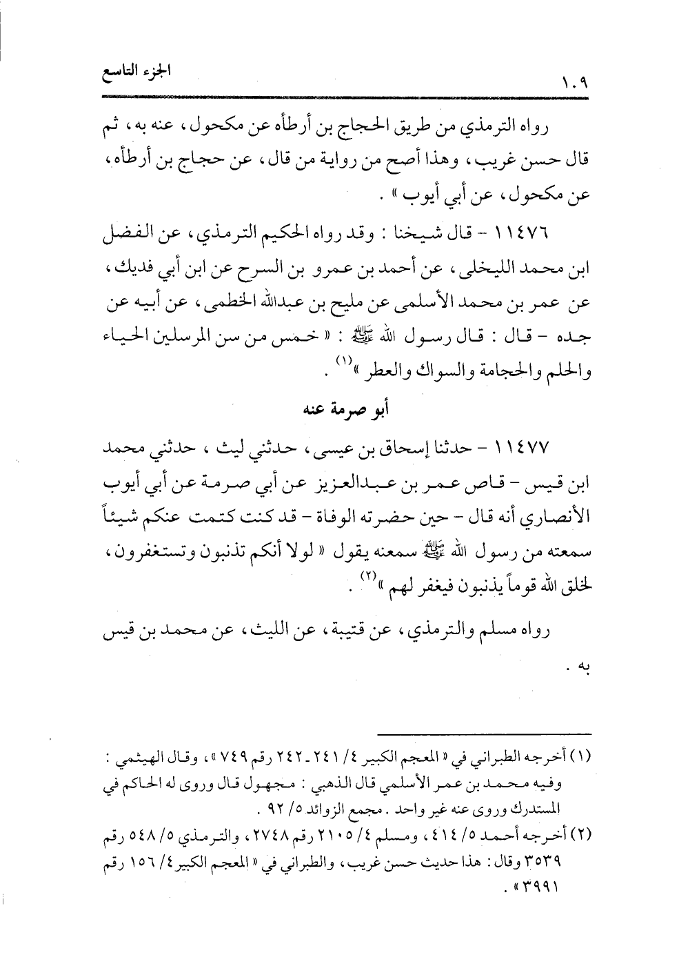 11477 - حدثنا إسحاق بن عيسى، حدثنى ليث، حدثنى محمد ابن قيس ـ قاص عمر بن عبد العزيز عن أبى صرمة عن أبى أيوب الأنصارى أنه قال ـ حين حضرته الوفاة ـ قد كنت كتمت عنكم شيئًا سمعته من رسول الله - صلى الله عليه وسلم - سمعته يقول «لولا أنكم تذنبون وتستغفرون، لخلق الله قومًا يذنبون فيغفر لهم» (¬2) .