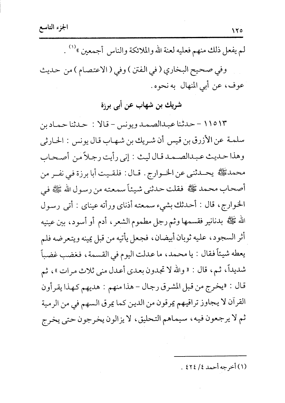 11513 - حدثنا عبد الصمد ويونس ـ قالا: حدثنا حماد بن سلمة عن الأزرق بن قيس أن شريك بن شهاب قال يونس: الحارثى وهذا حديث عبد الصمد قال ليث: إنى رأيت رجلاً من أصحاب محمد - صلى الله عليه وسلم - يحدثنى عن الخوارج. قال: فلقيت أبا برزة فى نفر من أصحاب محمد - صلى الله عليه وسلم - فقلت حدثنى شيئًا سمعته من رسول الله - صلى الله عليه وسلم - فى الخوارج، قال: أحدثك بشىء سمعته أذنادى ورأته عيناى: أتى رسول الله - صلى الله عليه وسلم - بدنانير قسمها وثم رجل مطموم الشعر، أدم أو أسود، بين عينيه أثر السجود، عليه ثوبان أبيضان، فجعل يأتيه من قبل يمينه ويتعرضه فلم يعطه شيئًا فقال: يا محمد، ما عدلت اليوم فى القسمة، فغضب غضبًا شديدًا، ثم قال: «والله لا تجدن بعدى أعدل منى ثلاث مرات» ، ثم قال: «يخرج من قبل المشرق رجال ـ هذا منهم: هديهم كهذا يقرأون القرآن لا يجاوز تراقيهم يمرقون من الدين كما يمرق السهم فى من الرمية ثم لا يرجعون فيه، سيماهم التحليق، لا يزالون يخرجون حتى يخرج
