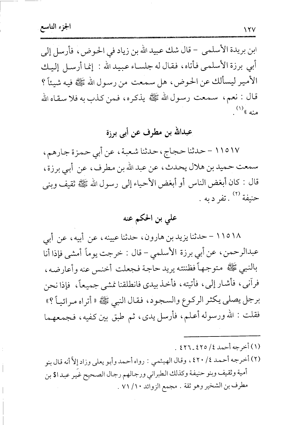 11518 - حدثنا يزيد بن هارون، حدثنا عيينة، عن أبية، عن أبى عبد الرحمن، عن أبى برزة الأسلمى ـ قال: خرجت يومًا أمشى فإذا أنا بالنبى - صلى الله عليه وسلم - متوجهاً فظننته يريد حاجة فجعلت أخنس عنه وأعارضه، فرآنى، فأشار إلى، فأتيته، فأخذ بيدى فانطلقنا نمشى جميعاً، فإذا نحن برجل يصلى يكثر الركوع والسجود، فقال النبى - صلى الله عليه وسلم - «أتراه مرائيًا؟» فقلت: الله ورسوله أعلم، فأرسل يدى، ثم طبق بين كفيه، فجمعهما