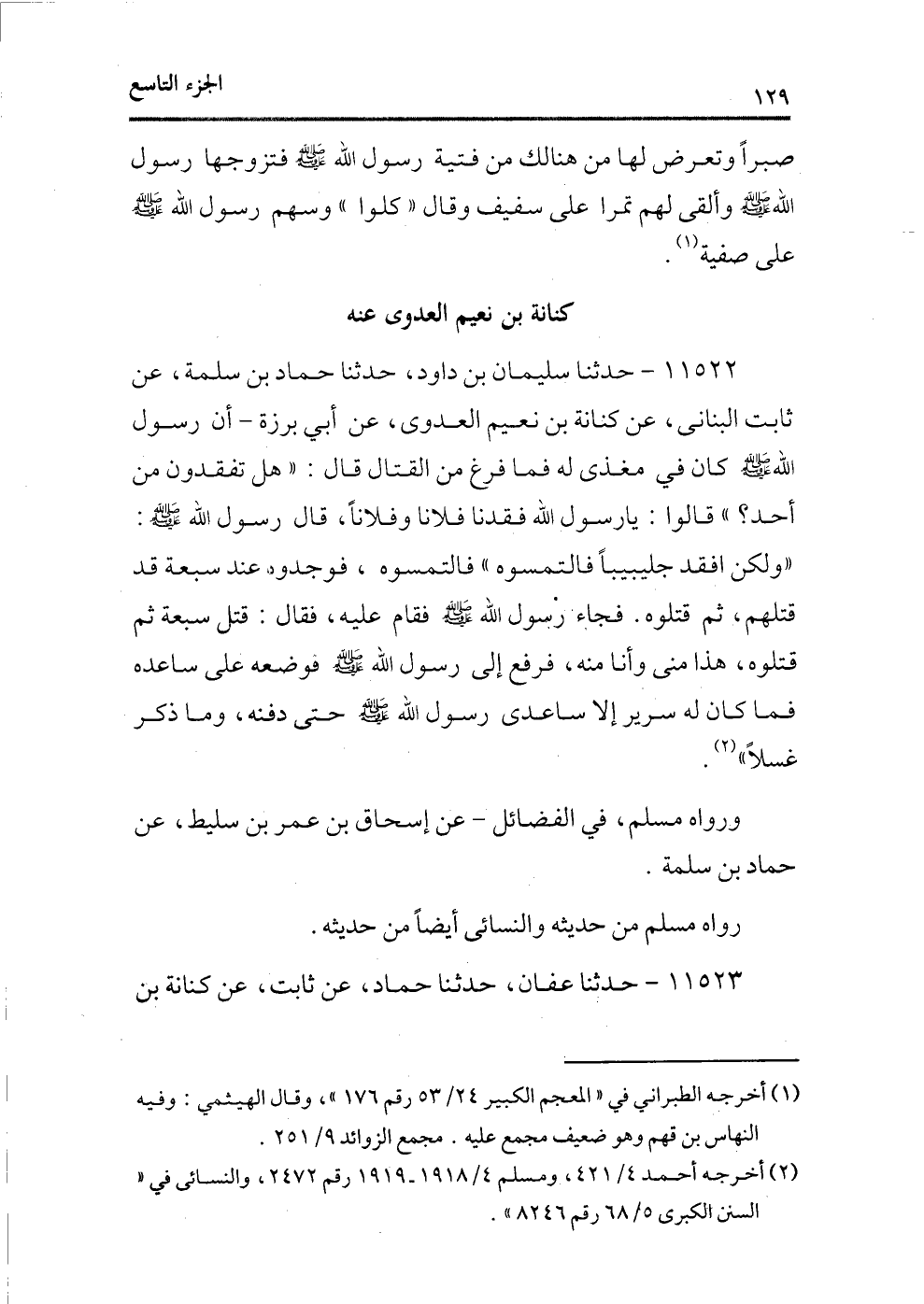 11522 - حدثنا سلميان بن داود، حدثنا حماد بن سلمة، عن ثابت البنانى، عن كنانة بن نعيم العدوى، عن أبى برزة ـ أن رسول الله - صلى الله عليه وسلم - كان فى مغذى له فما فرغ من القتال قال: «هل تفقدون من أحد؟» قالوا: يا رسول الله فقدنا فلانًا وفلانًا، قال رسول الله - صلى الله عليه وسلم -: «ولكن افقد جليبيبًا فالتمسوه» فالتمسوه، فوجدوه عند سبعة قد قتلهم، ثم قتلوه. فجاء رسول الله - صلى الله عليه وسلم - فقام عليه، فقال: قتل سبعة ثم قتلوه، هذا منى وأنا منه، فرفع إلى رسول الله - صلى الله عليه وسلم - فوضعه على ساعده فما كان له سرير إلا ساعدى رسول الله - صلى الله عليه وسلم - حتى دفنه، وما ذكر غسلاً (¬1) .