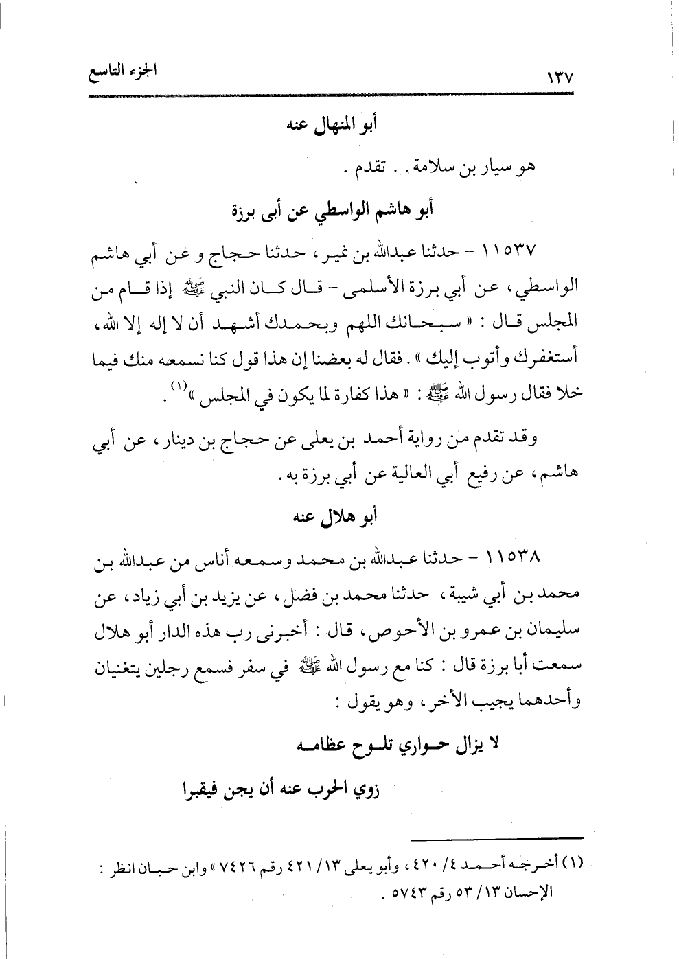 11537 - حدثنا عبد الله بن نمير، حدثنا حجاج وعن أبى هاشم الواسطى، عن أبى برزة الأسلمى ـ قال كان النبى - صلى الله عليه وسلم - إذا قام من المجلس قال: «سبحانك اللهم وبحمدك أشهد أن لا إله إلا الله، أستغفرك وأتوب إليك» . فقال له بعضنا إن هذا قول كنا نسمعه منك فيما خلا فقال رسول الله - صلى الله عليه وسلم -: «هذا كفارة لما يكون فى المجلس» (¬1) .