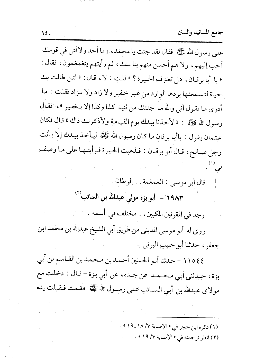 11544 - حدثنا أبو الحسين أحمد بن محمد بن القاسم بن أبى برزة، حدثنى أبى محمد عن جده، عن أبى برزة ـ قال: دخلت مع مولاى عبد الله بن أبى السائب على رسول الله - صلى الله عليه وسلم - فقمت فقبلت يده