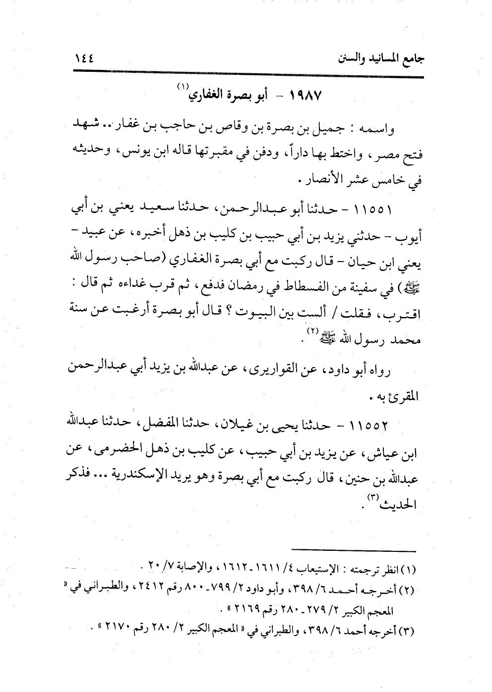 11552 - حدثنا يحيى بن غيلان، حدثنا المفضل، حدثنا عبد الله بن عياش، عن يزيد بن أبى حبيب، عن كليب بن ذهل الحضرمى، عن عبد الله بن حنين، قال ركبت مع أبى بصرة وهو يريد الإسكندرية.. فذكر الحديث (¬3) .