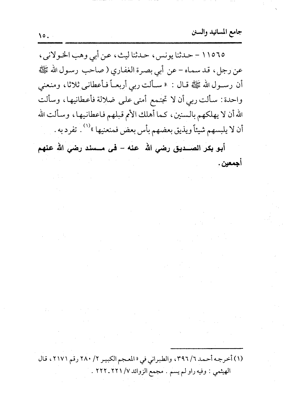 11565 - حدثنا يونس، حدثنا ليث، عن أبى وهب الخولانى، عن رجل، قد سماه ـ عن أبى بصرة الغفارى صاحب رسول الله - صلى الله عليه وسلم - أن رسول الله - صلى الله عليه وسلم - قال: «سألت ربى أربعًا فأعطانى ثلاثًا، ومنعنى واحدة: سألت ربى أن لا تجتمع أمتى على ضلالة فأعطانيها، وسألت الله أن لا يهلكم بالسنين، كما أهلك الأمم قبلهم فاعطانيها، وسألت الله أن لا يلبسهم شيئًا ويذيق بعضهم بأس بعض فمنعنيها» (¬1) . تفرد به.