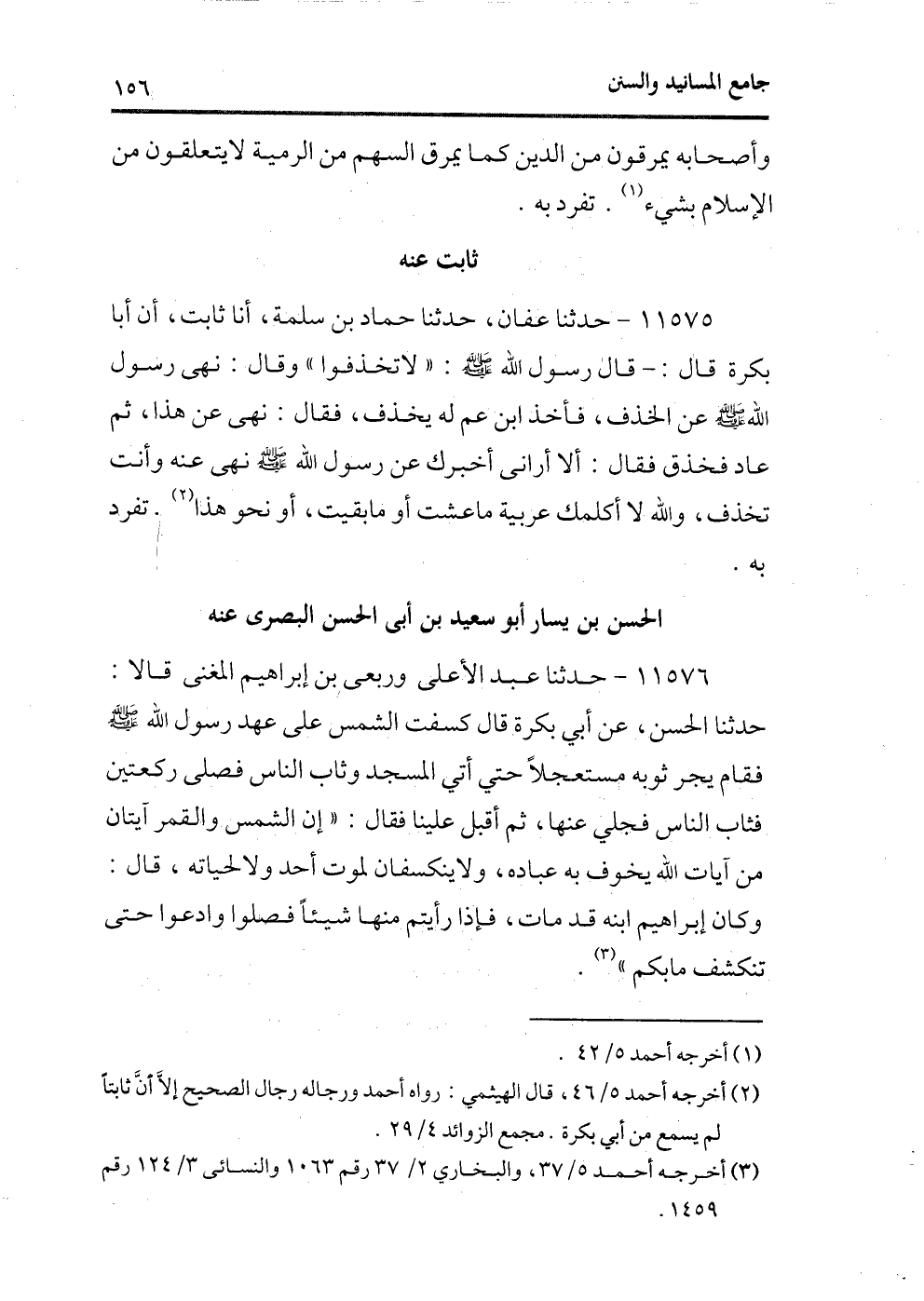 11575 - حدثنا عفان، حدثنا حماد بن سلمة، أن ثابت، أن أبا بكرة قال: ـ قال رسول الله - صلى الله عليه وسلم -: «لا تخذفوا» وقال: نهى رسول الله - صلى الله عليه وسلم - عن الخذف، فأخذ ابن عم له يخذف، فقال: نهى عن هذا، ثم عاد فخذف فقال: ألا أرانى أخبرك عن رسول الله - صلى الله عليه وسلم - نهى عنه وأنت تخذف، والله لا أكلمك عربية ما عشت أو ما بقيت، أو نحو هذا (¬1) . تفرد به.